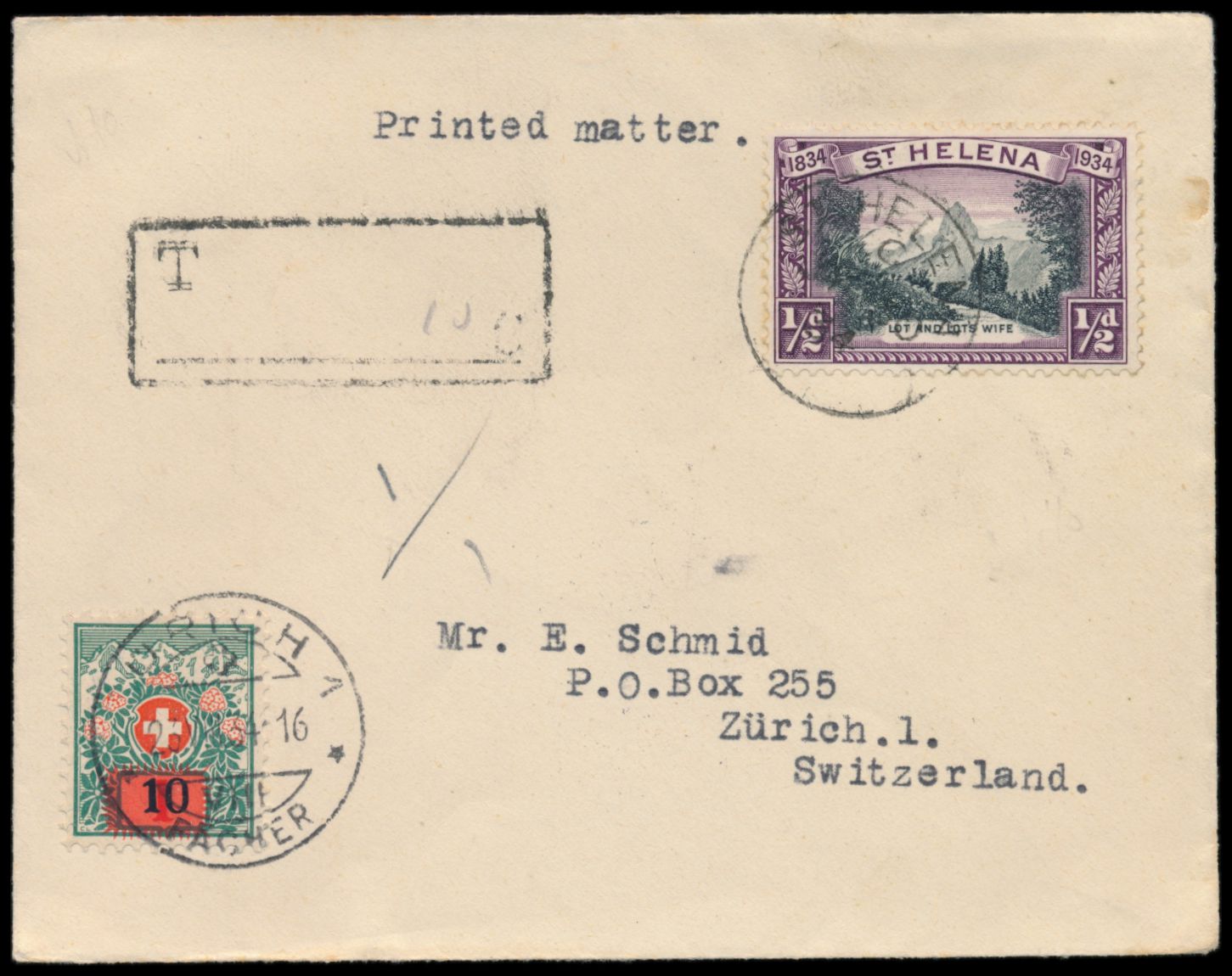 St. Helena, 1/2 d. "100 Jahre Kronkolonie" auf Drucksache in die Schweiz, Stempel St. Helena 30.7.34, T.-Stempel von St. Helena, handschriftlich 10 C., Schweiz-Portomarke 10 Rp. frankiert, Stempel Zürich 22.8.34