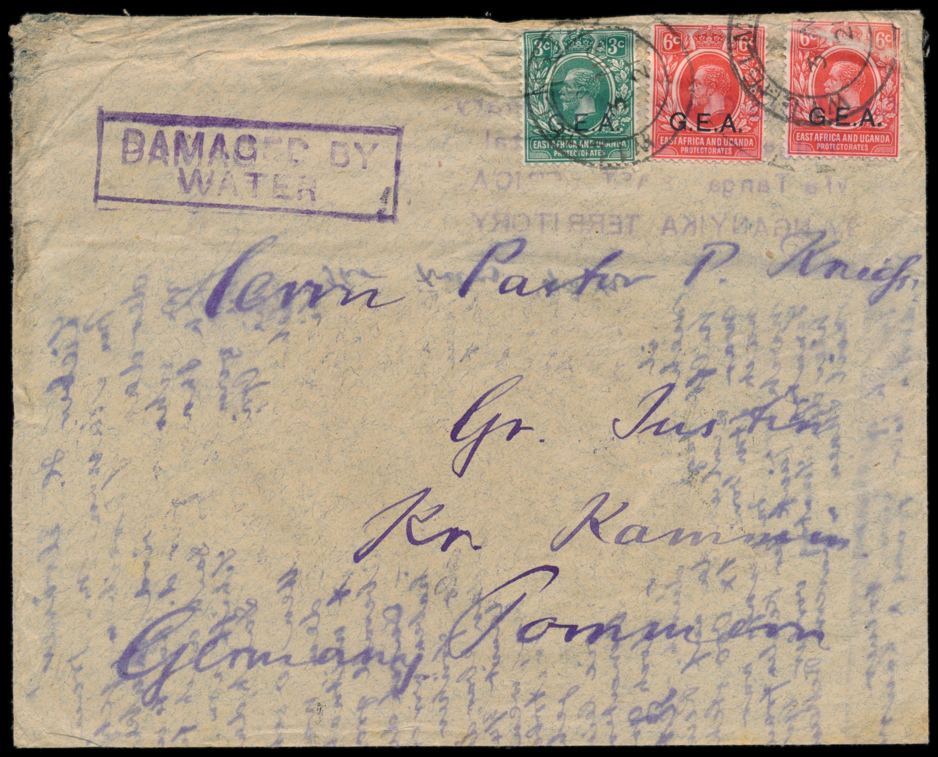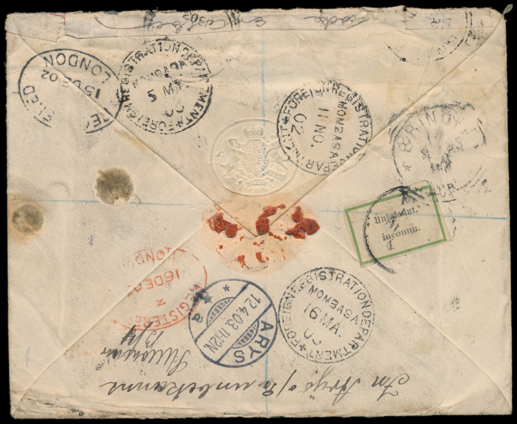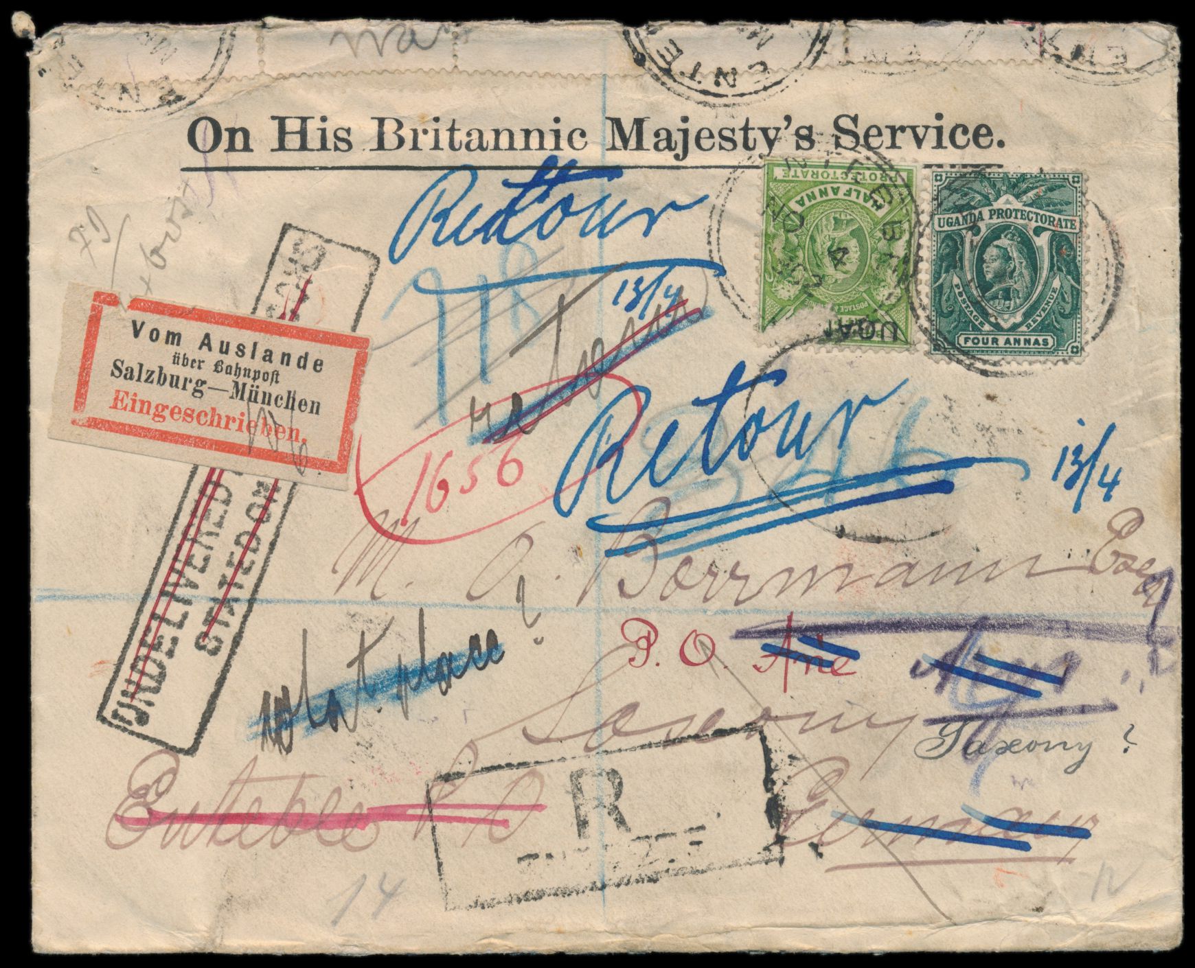 Uganda, Dienstbriefumschlag "On His Britannic Majesty´s Service" mit 1/2 A. (beschädigt) und 4 A. als Einschreiben von Entebbe 4.11.1902 nach Deutschland und wieder zurück, entsprechende Vermerke und Durchgangsstempel, bayerischer R-Zettel "Vom Auslande über Bahnpost Salzburg - München" , Bedarf