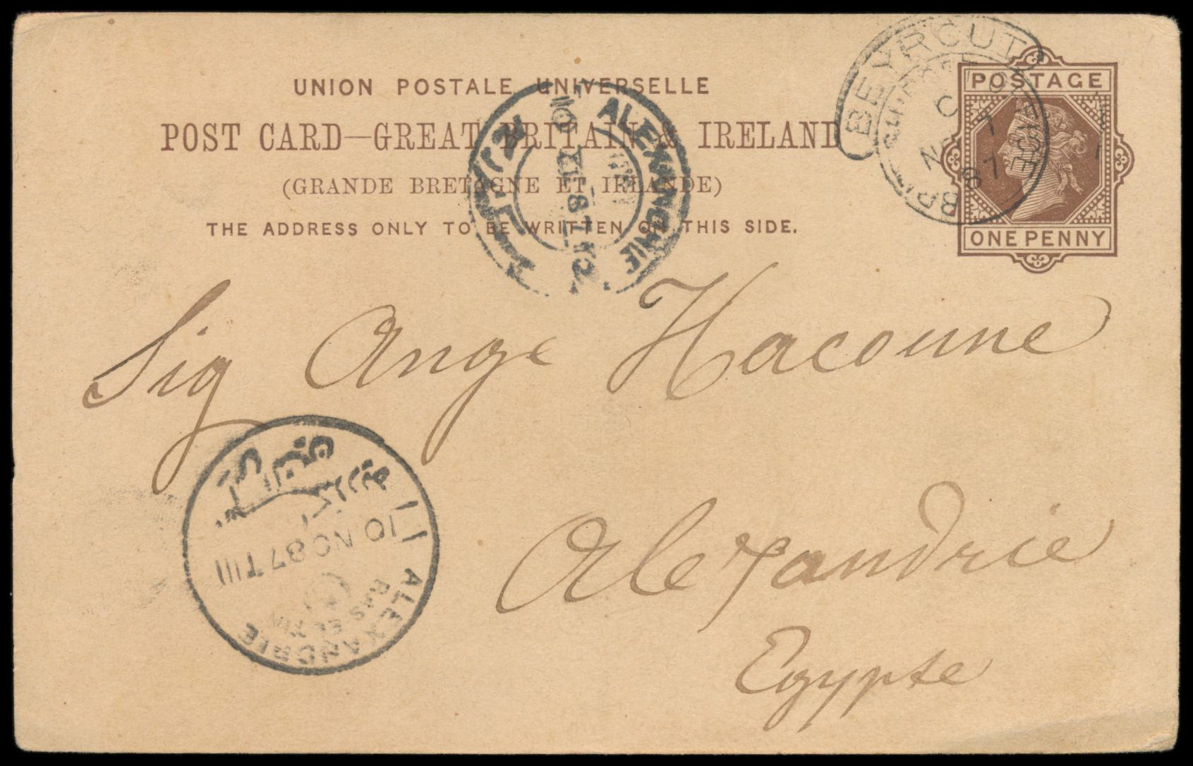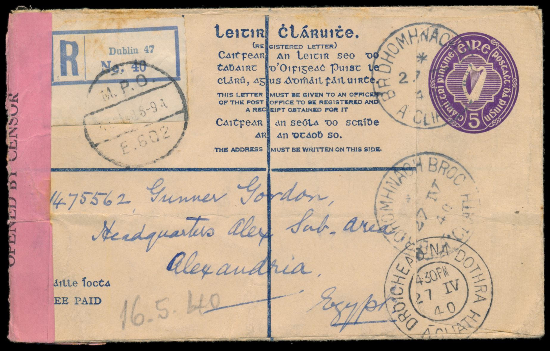 R-Ganzsachenumschlag 5 Pg. (Format G) von Dublin 27.4.40 ohne Zusatzfrankatur an einen britischen Soldaten in Alexandria, portofrei, nur R-Gebühr bezahlt, links rosa irischer Zensurverschlusszettel, Ankunftstempel Alexandria 16.5.40 und Militärpoststempel M.P.O. E. 602 17.5.40, schwacher waagerechter Bug, Bedarf