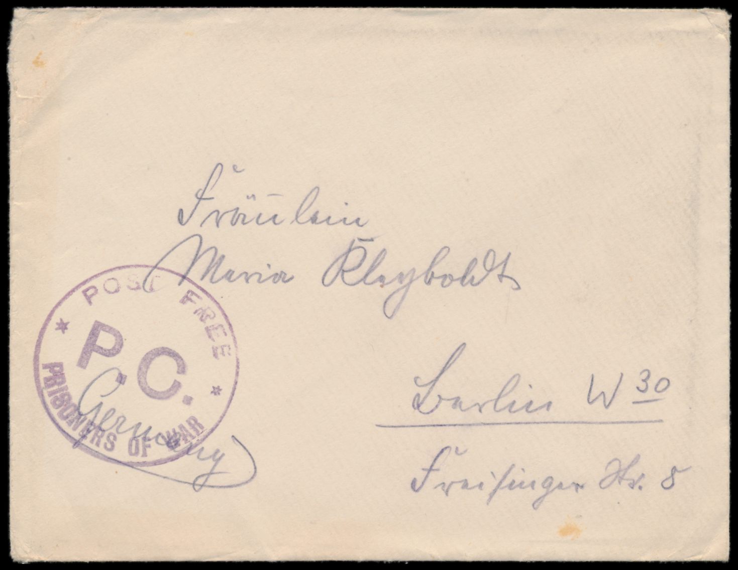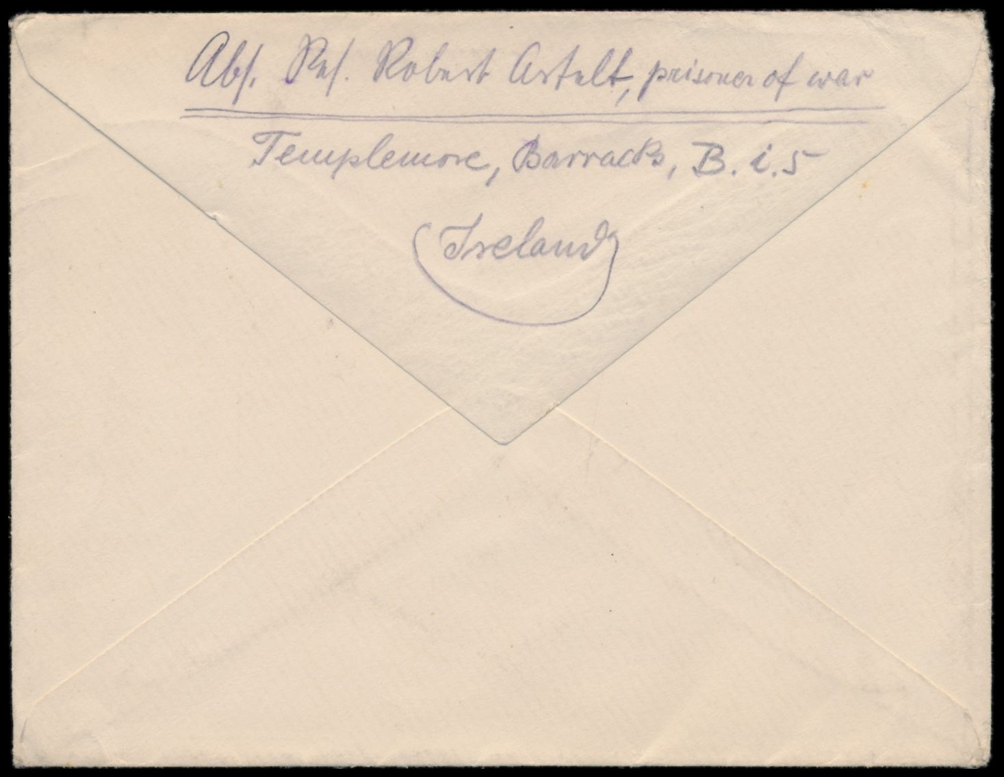 Brief eines deutschen Kriegsgefangenen im P-o.W. Camp Templemore Barracks nach Berlin, violetter Kreisstempel Post Free / P.C. / Prisoner of War
