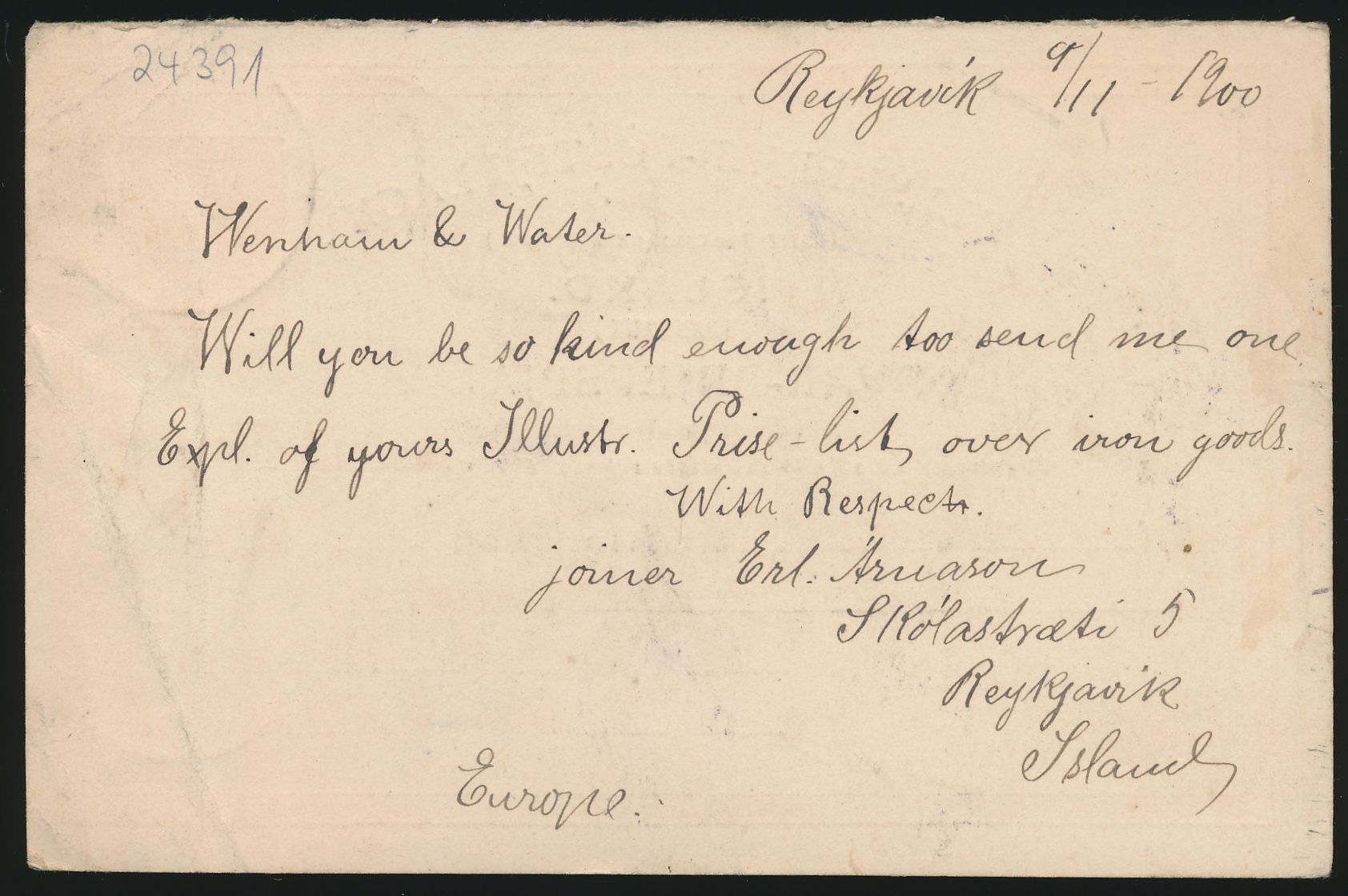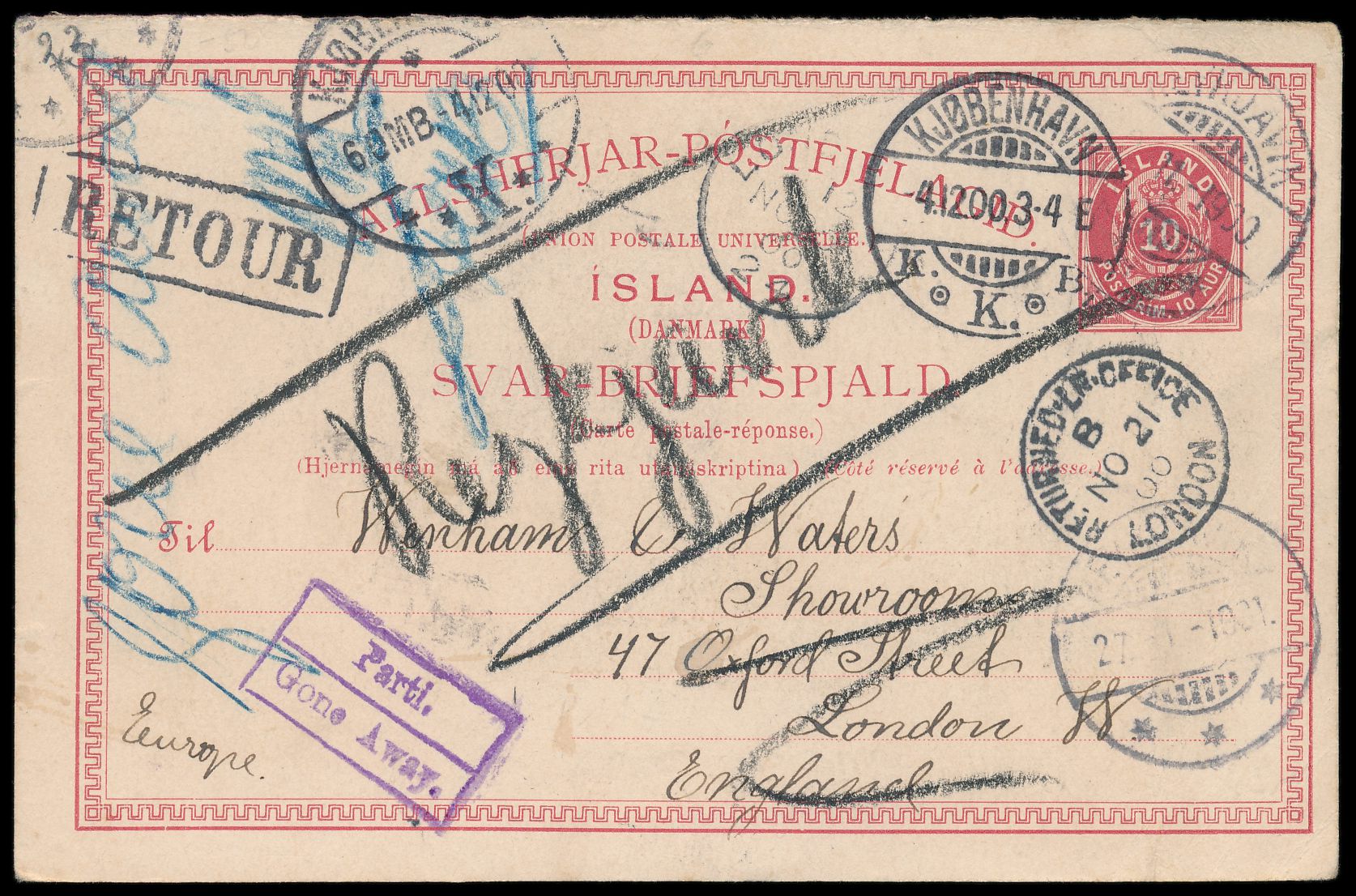 Ganzsachen-Antwortteil 10 Aur mit Stempel Reykjavik 9.11.00 nach London, Stempel "Parti / Gone away" und Retour, Returned Lr.-Office 21.11.00, Transitstempel Kjobenhavn 4.12.00, Ankunftstempel Reykjavik 27.1.01, Bedarf