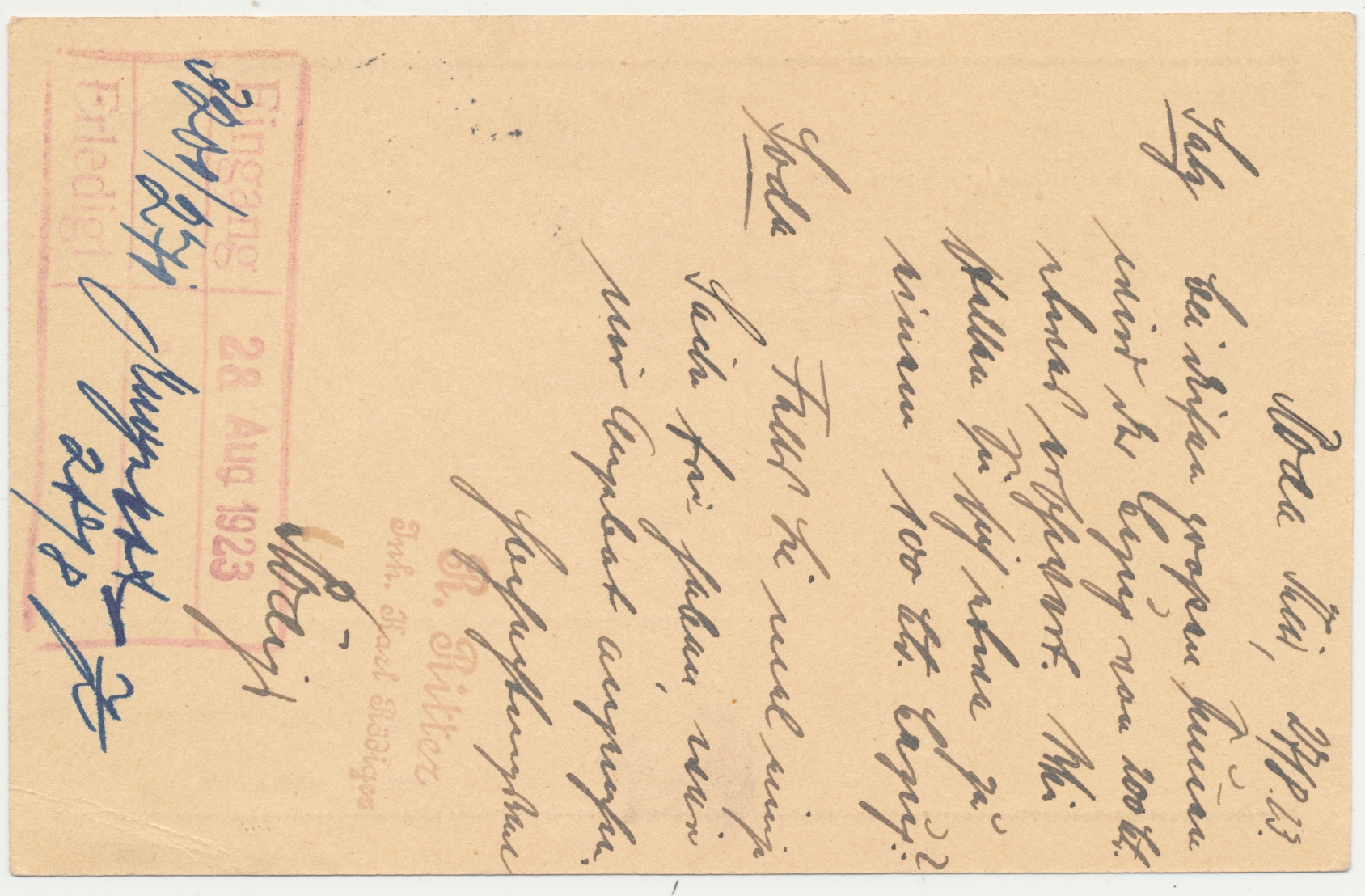 Dallmin (Westprignitz), gesiegelter Wertbrief 30.8.23 mit Wertangabe "Zwanzig Millionen" nach Ludwigslust, handschriftlich "Lt. Ein. Nachw. 245.000,-" und zwei Unterschriften