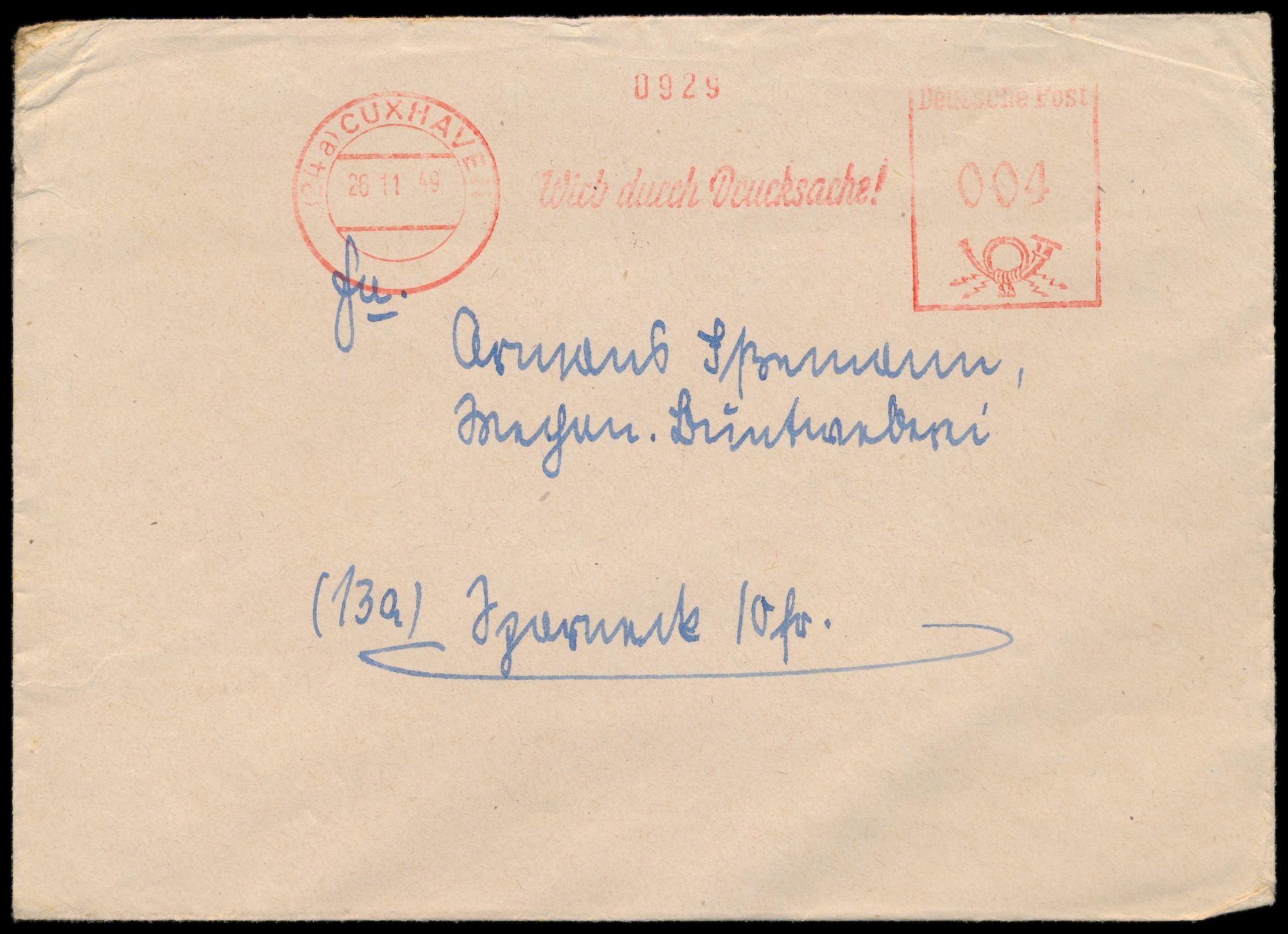 Francotyp C-Absenderfreistempel Cuxhaven 26.11.49 mit Werbeeinsatz "Wirb durch Drucksache!" und Wertangabe 004 Pf. als Postfreistempel auf Drucksache, in Cuxhaven selten, Bedarf