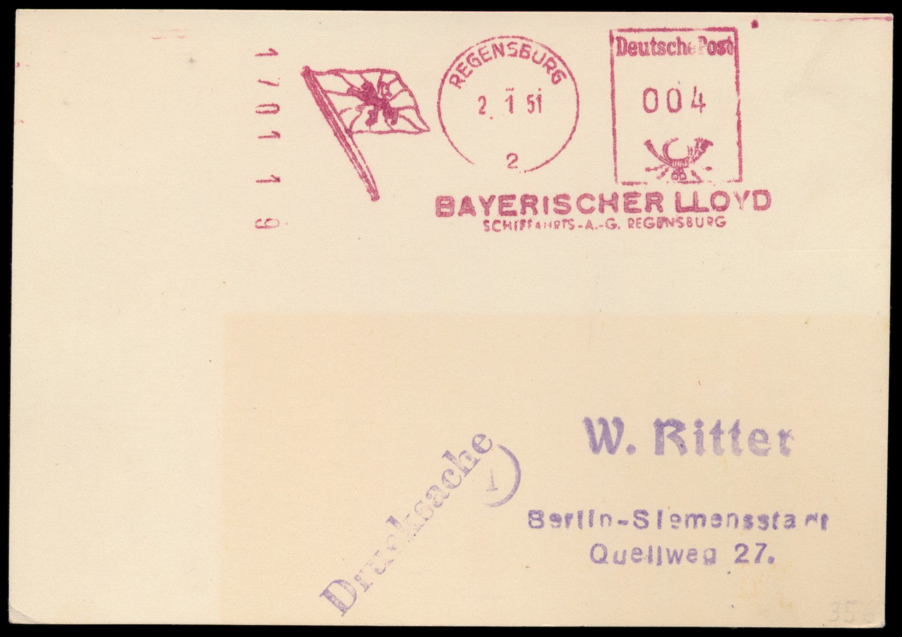 Absenderfreistempel Komusina, seltene späte Verwendung als Drucksache mit 004 Pfg. Regensburg Bayrischer Lloyd 2.1.51 nach Berlin , ohne Text