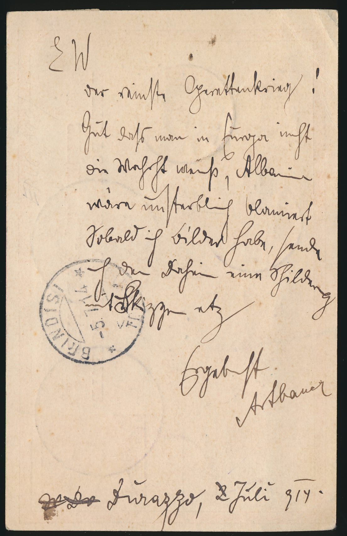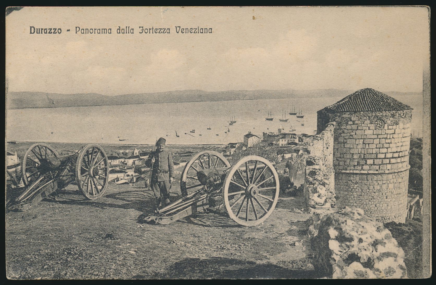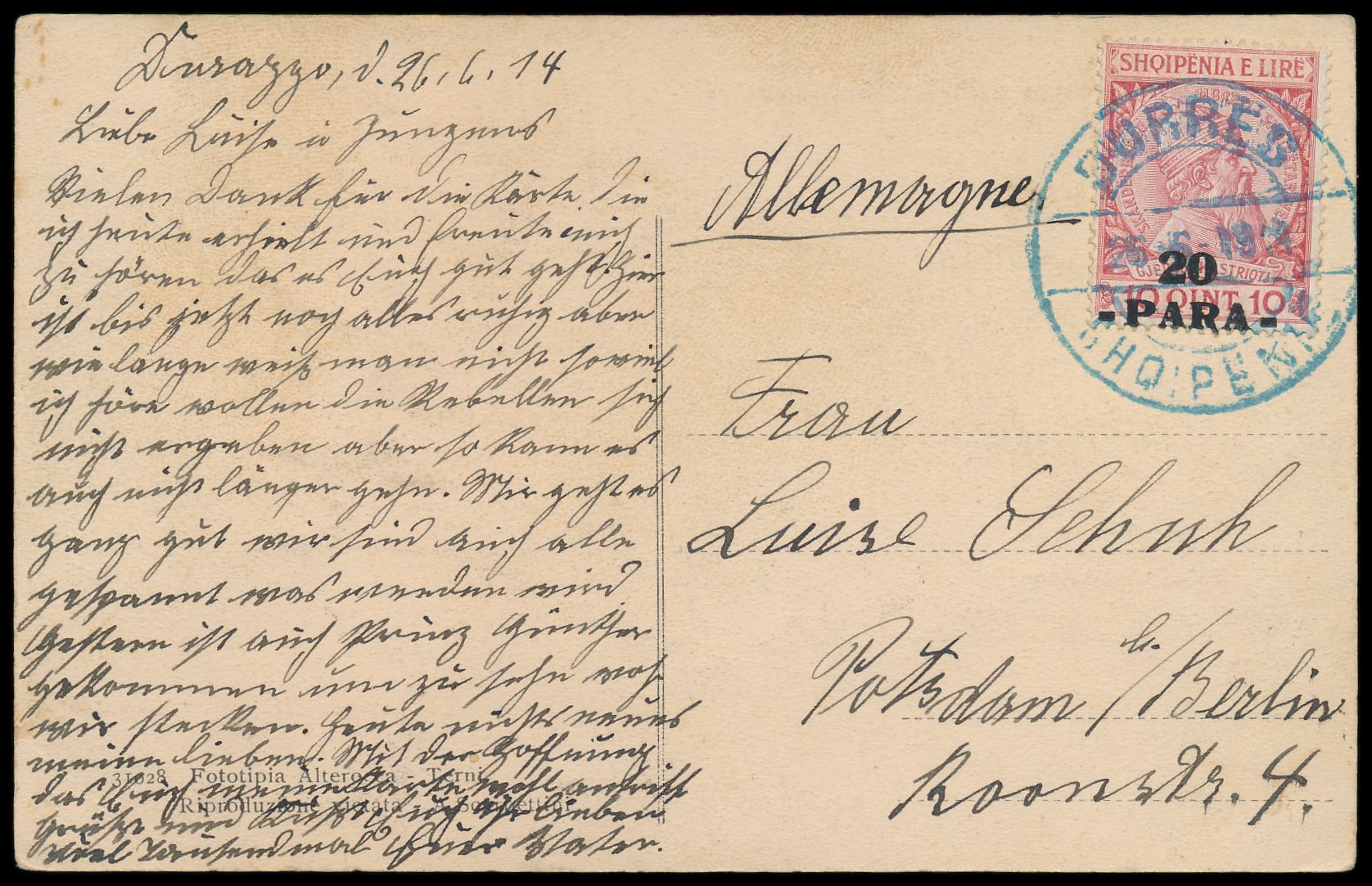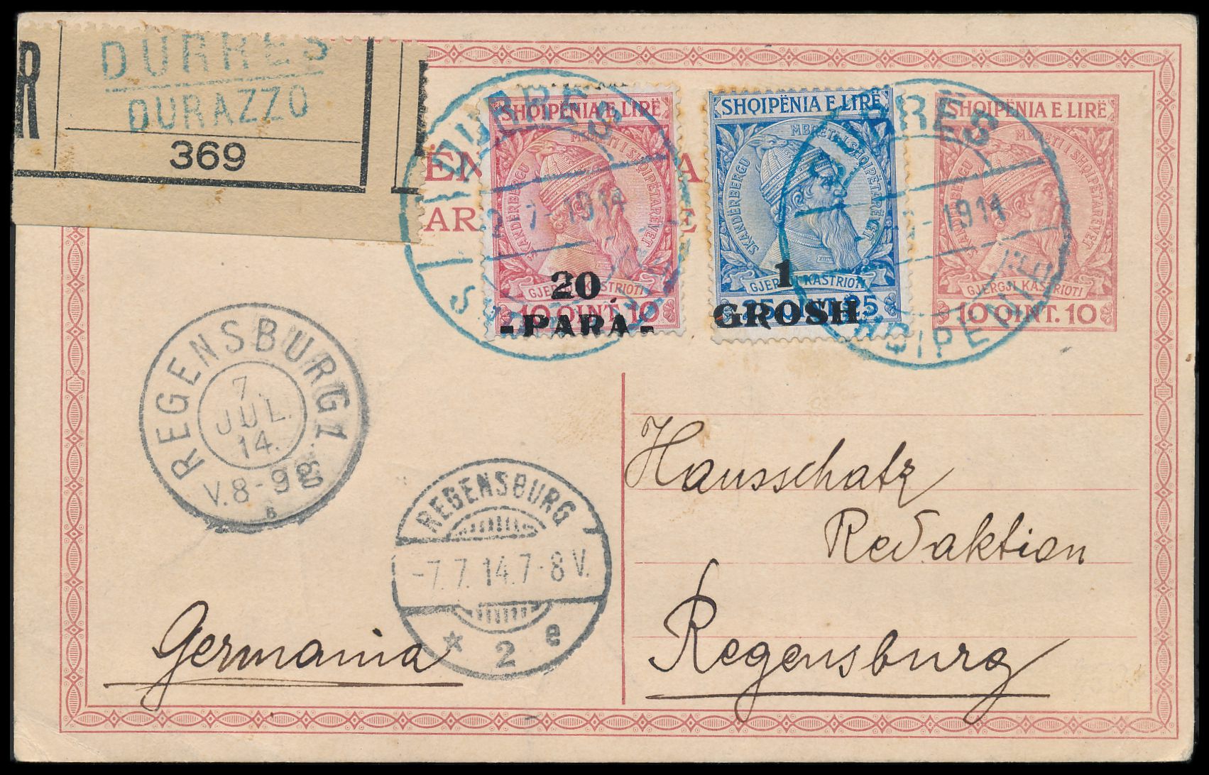 Ganzsache 10 Q. Skanderbeg mit Zusatzfrankatur 20 Pa. auf 10 Q. und 1 Gr. auf 25 Q. als Einschreiben nach Deutschland, blauer Stempel Durres 2.7.1914, Blanko-R-Zettel mit L2 Durres / Durazzo, Durchgangsstempel Brindisi 5.7.14, Ankunftsstempel Regensburg 7.7.14, Bedarf