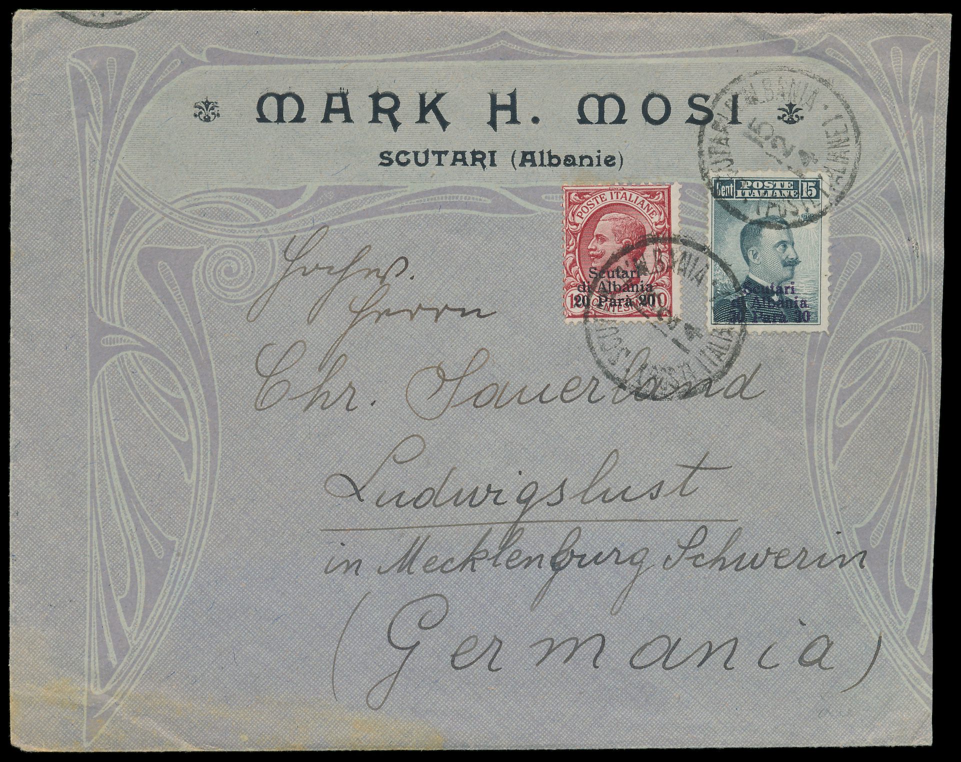 Italienische Post: Scutari d´Albania 20 Pa. auf 10 C. und 30 Pa. auf 15 C. auf dekorativem Firmenumschlag nach Deutschland, Stempel Scutari d´Albania 15.12.14, seltenes Kriegsdatum, Bedarf