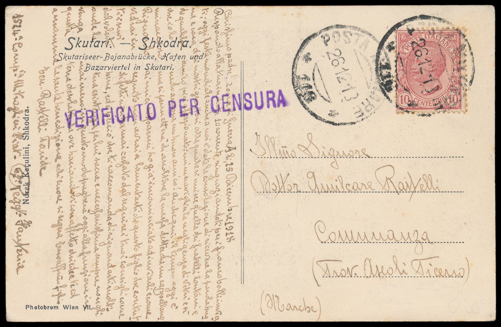 Italienische Besetzung, Italien 10 C. Leoni mit Stempel Posta Militare 116 26.12.18 auf Ansichtskarte Skutari / Shkodra nach Italien, violetter L1 Verificato per Censura, Bedarf