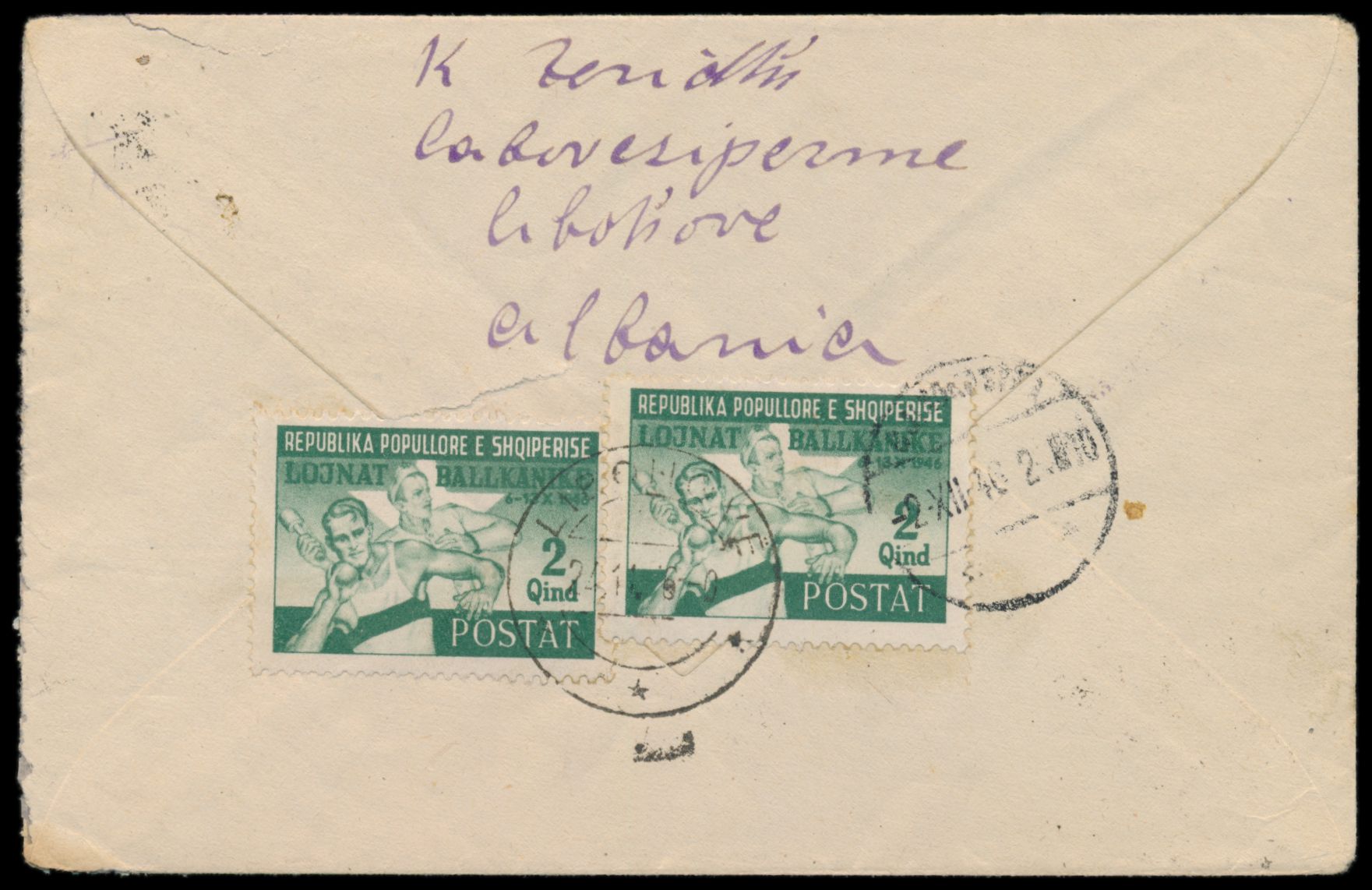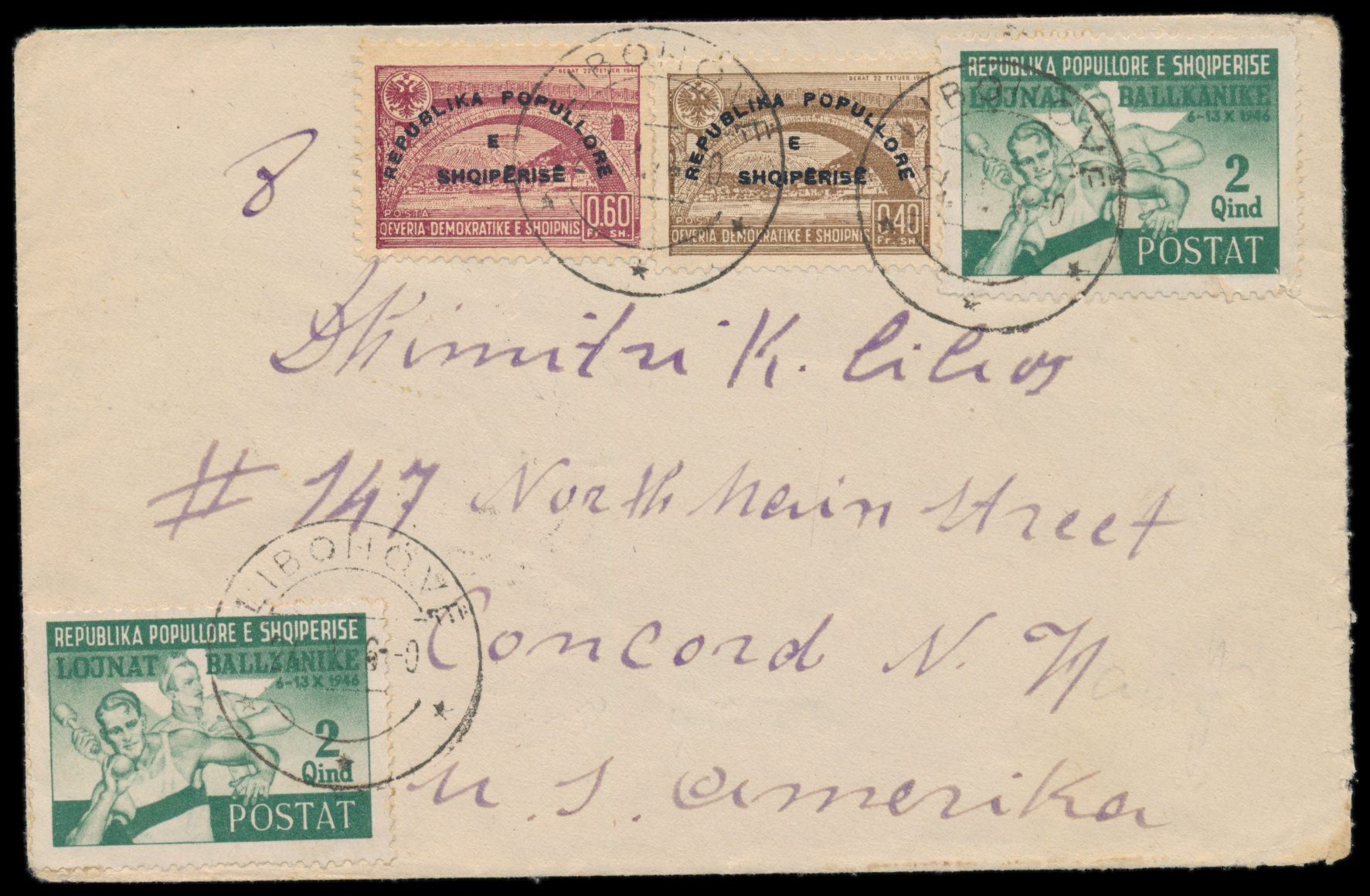 Volksrepublik, Ausrufung der Volksrepublik 0,40 Fr. und 0,60 Fr. mit 2 x Balkan-Spiele 2 Q. auf Brief nach USA, weiterverwendeter italienischer Stempel Libohove 24.11.46, Bedarf