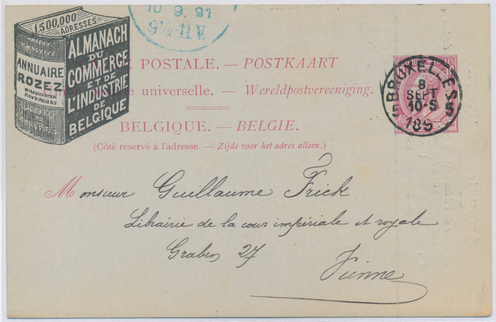 Ganzsache 10 C. mit Bildzudruck Almanach du Commerce, Stempel Bruxelles 8.9.1891, nach Wien, Ankunftstempel 10.9.91