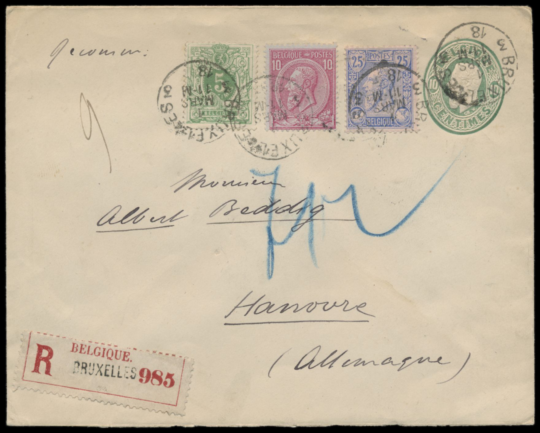 Ganzsachenumschlag 10 C. mit 5, 10 und 25 C. als Einschreiben nach Deutschland, Stempel Bruxelles 1.3.93, Ankunftstempel Hannover 2.3.93, portorichtig, Bedarf