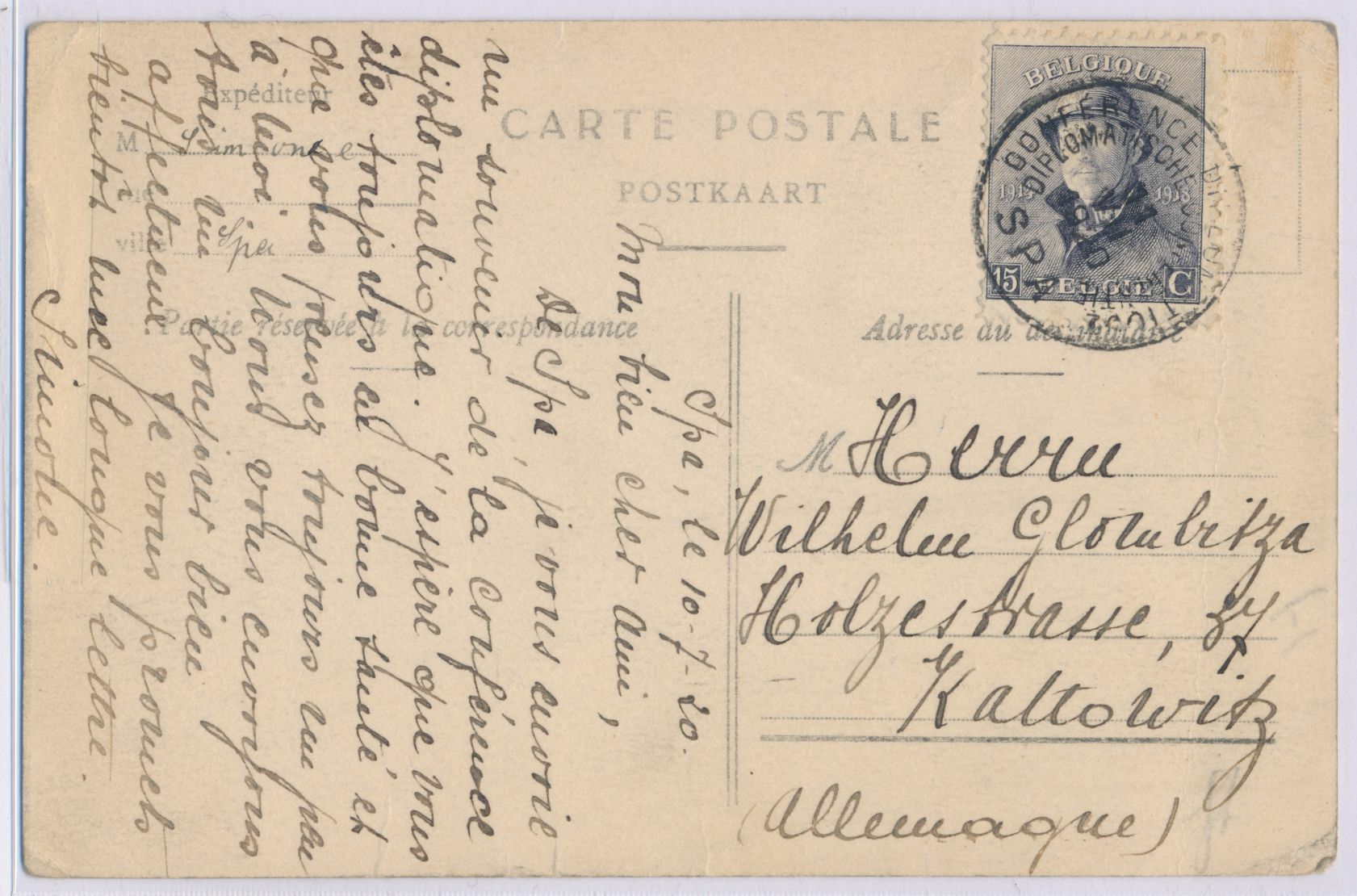 Sonderstempel Conference Diplomatique ... Spa 11.7.1920 auf Ansichtskarte Grand Hotel Britannique (war 1918 Sitz des deutschen Großen Hauptquartiers, hier dankte Kaiser Wilhelm am 9.11.1918 ab), Frankatur 15 C. nach Kattowitz / Oberschlesien, Bedarf