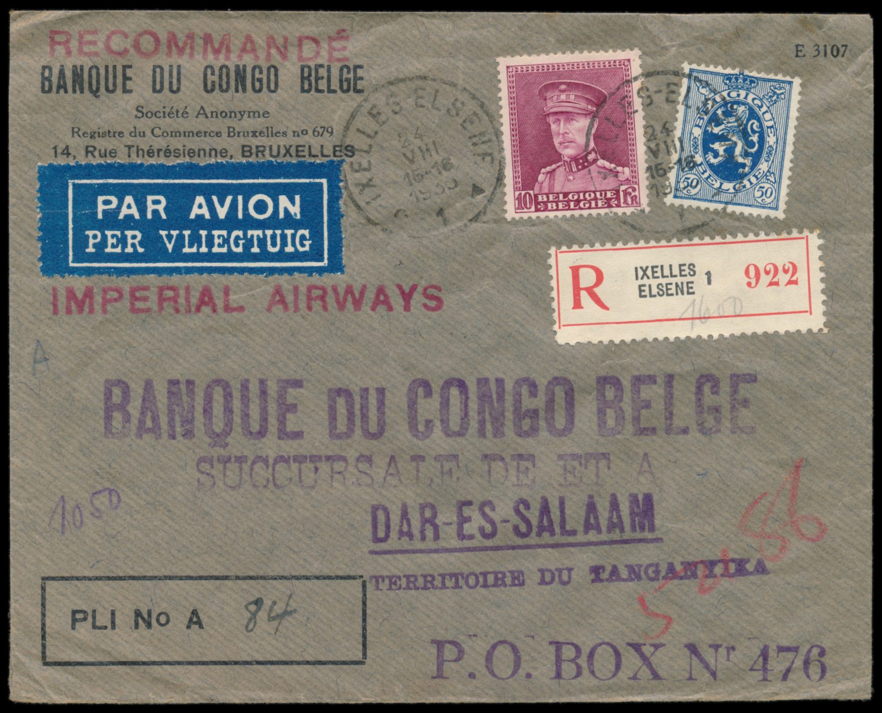 50 C. Wappenlöwe und Höchstwert 10 F. König Albert auf Luftpost-Einschreibbrief nach Tanganyika, Stempel Ixelles - Elsene 24.8.35, Durchgangsstempel Nairobi 30.8.35 und Dodoma 31.8.35, Ankunftsstempel Daressalaam 2.9.1935, Bedarf