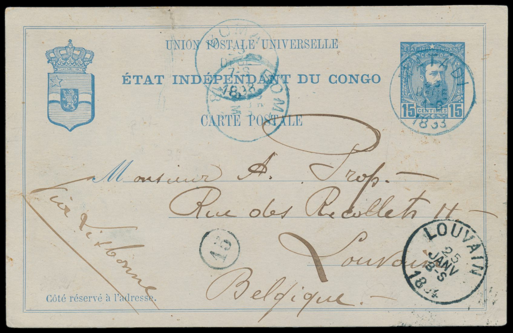 Belgisch-Congo, Ganzsache 15 C. König Leopold, blauer Stempel Matadi 23.12.1893, nach Belgien, Durchgangsstempel Boma 25.12.1893, Ankunftstempel Louvain 25.1.1894, Bedarf