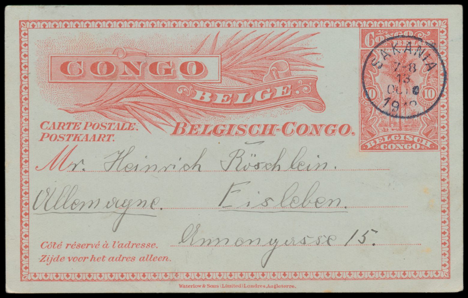 Belgisch-Kongo, Ganzsache 10 C. mit Stempel Sakania 13.10.1912 (District Haut Luapula / Haut-Katanga, im äußersten Südosten von Belgisch-Kongo), nach Deutschland, Bedarf