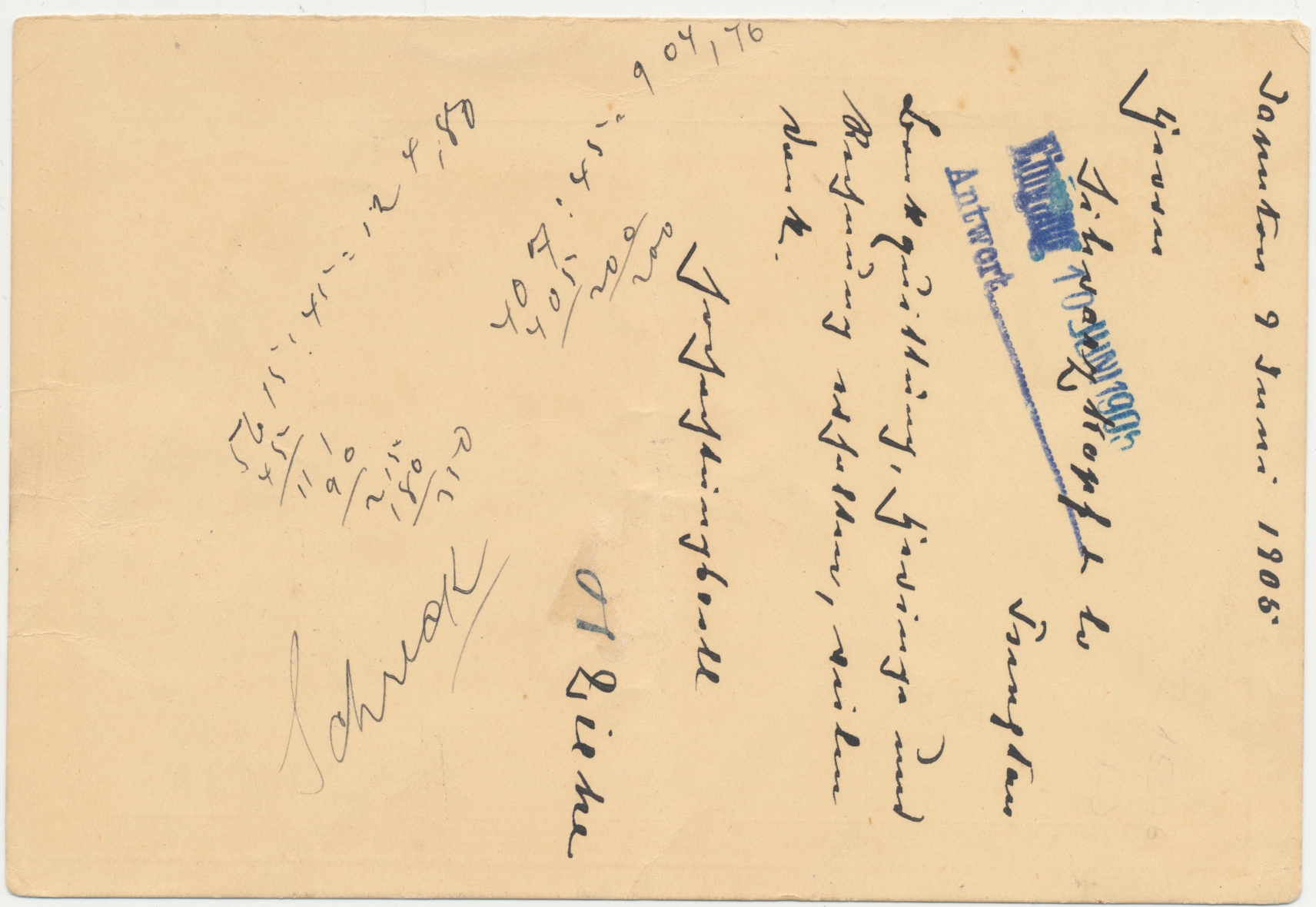 Ganzsachen-Antwortteil C.I.P. 1 C. (Han No. 3) , geschrieben in Taputur 9.6.1905, Lunar-Dater Kiachow, nach Tsingtau, Ankunftstempel Tsingtau / Kiautschou 11.6.05., schwacher senkrechter Mittelbug, Bedarf