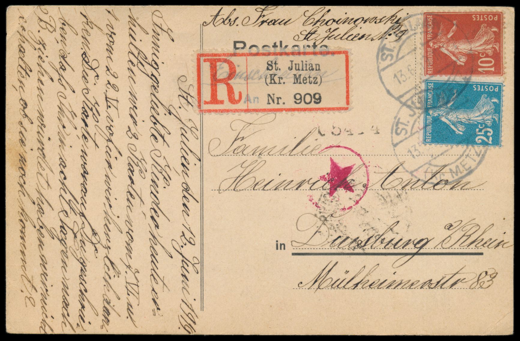 10 C. und 25 C. auf Einschreiben-Postkarte mit weiterverwendetem deutschen Stempel St. Julian (Kr. Metz) 13.6.19 nach Deutschland, weiterverwendeter deutscher R-Zettel, französischer Stern-Zensurstempel in rot, Bedarf