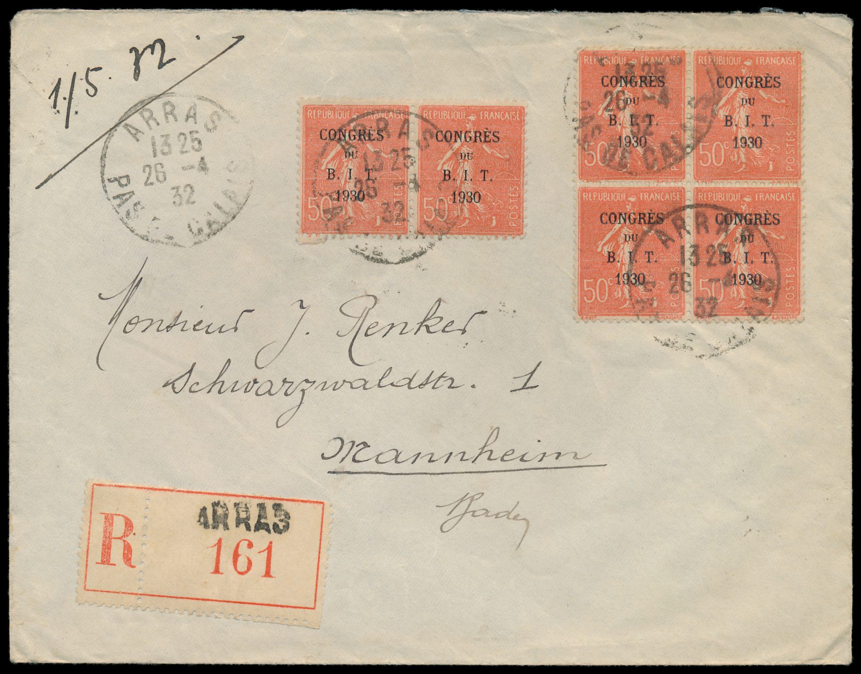 6 x 50 C. "Congrès de B.I.T. 1930" auf Einschreibbrief mit Stempel Arras 26.4.32 nach Deutschland, Ankunftsstempel Mannheim 27.4.32, Bedarf