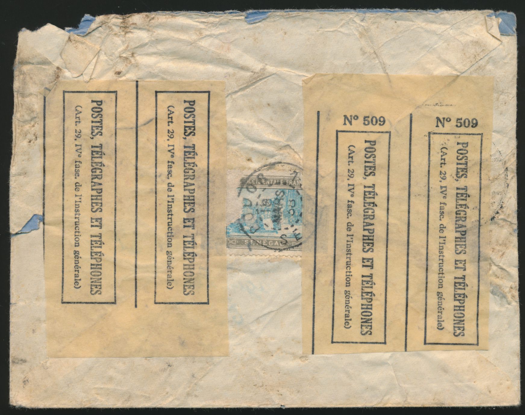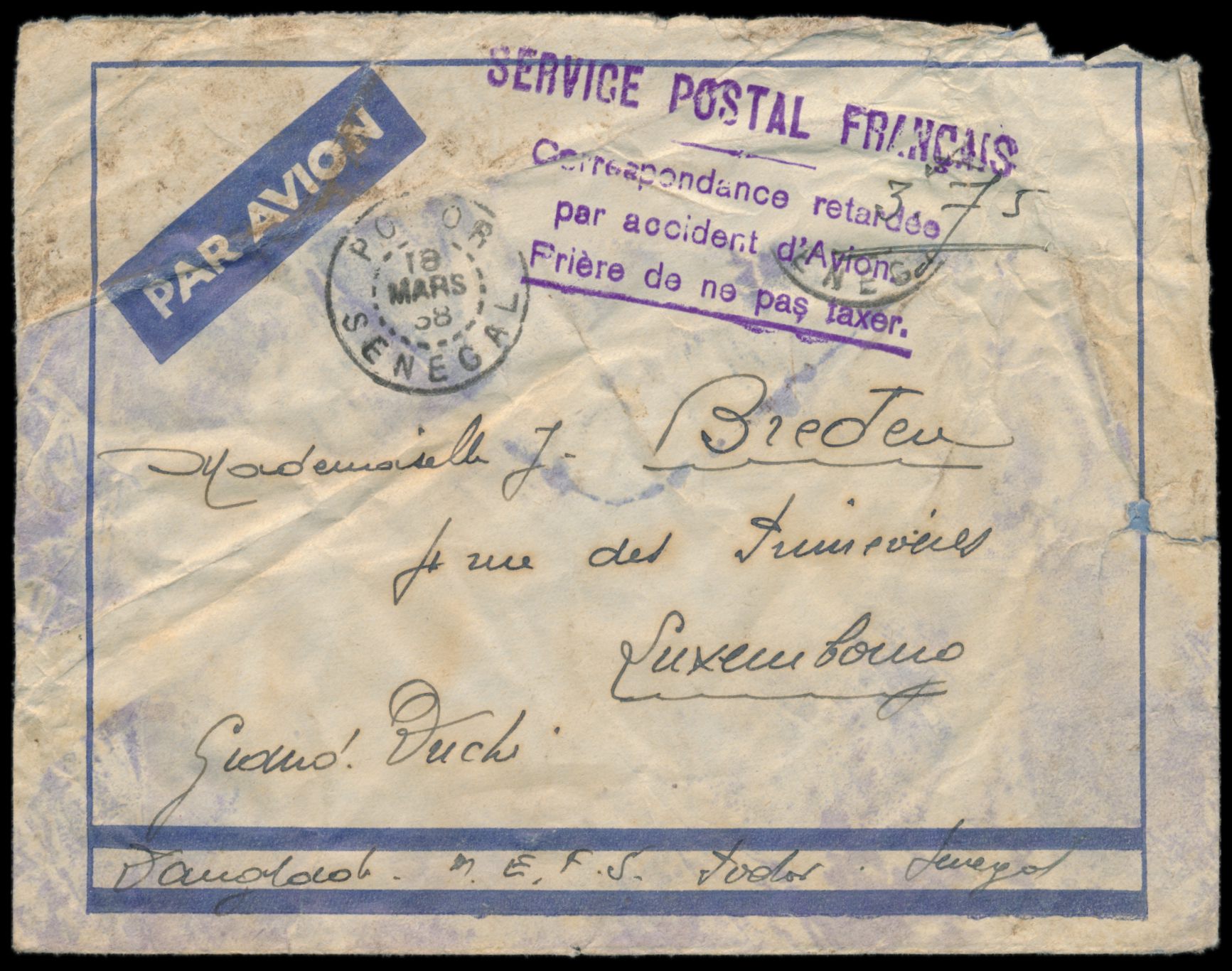 rückseitig frankierter Luftpostbrief aus dem Senegal mit Air France nach Luxemburg, Stempel Podor 23.3.38, mit Air France ab Marokko, aus dem in den Pyrenäen abgestürztem Flugzeug geborgen, großer Stempel Service Postal Francais ... par accident d´Avion ..., rückseitig 4 Verschlußaufkleber, leichte Beschädigungen