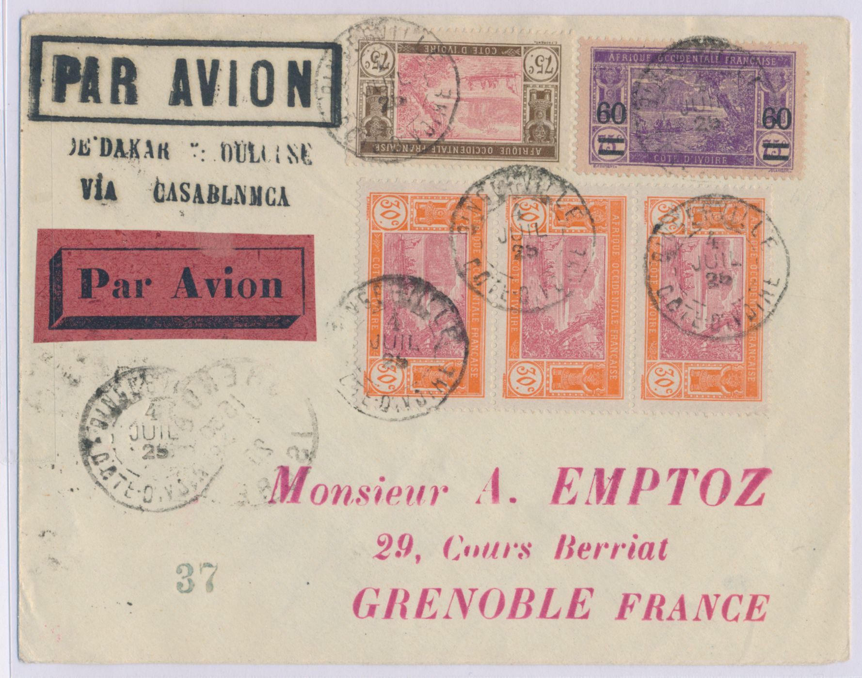 Elfenbeinküste, 5 Sondermarken Cote d´Ivoire auf Luftpostbrief nach Grenoble via Casablanca, Stempel Bingerville 4.7.25, Ankunftsstempel 1.8.25, dekorativ