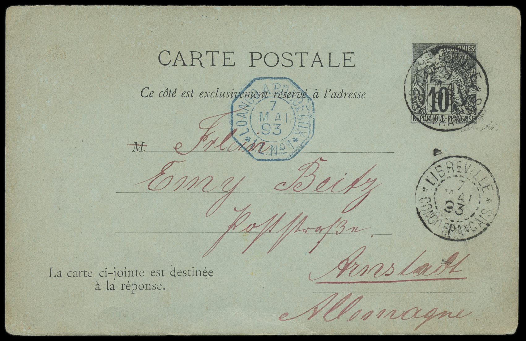 Französisch-Congo, Frage-Ganzsache 10 Ct. Colonies Postes, Stempel Libreville 7.5.93, Bedarf nach Deutschland, Transitstempel blauer Achteck-Stempel Loango a Bordeaux No. 1 7.5.93, Ankunftsstempel Arnstadt