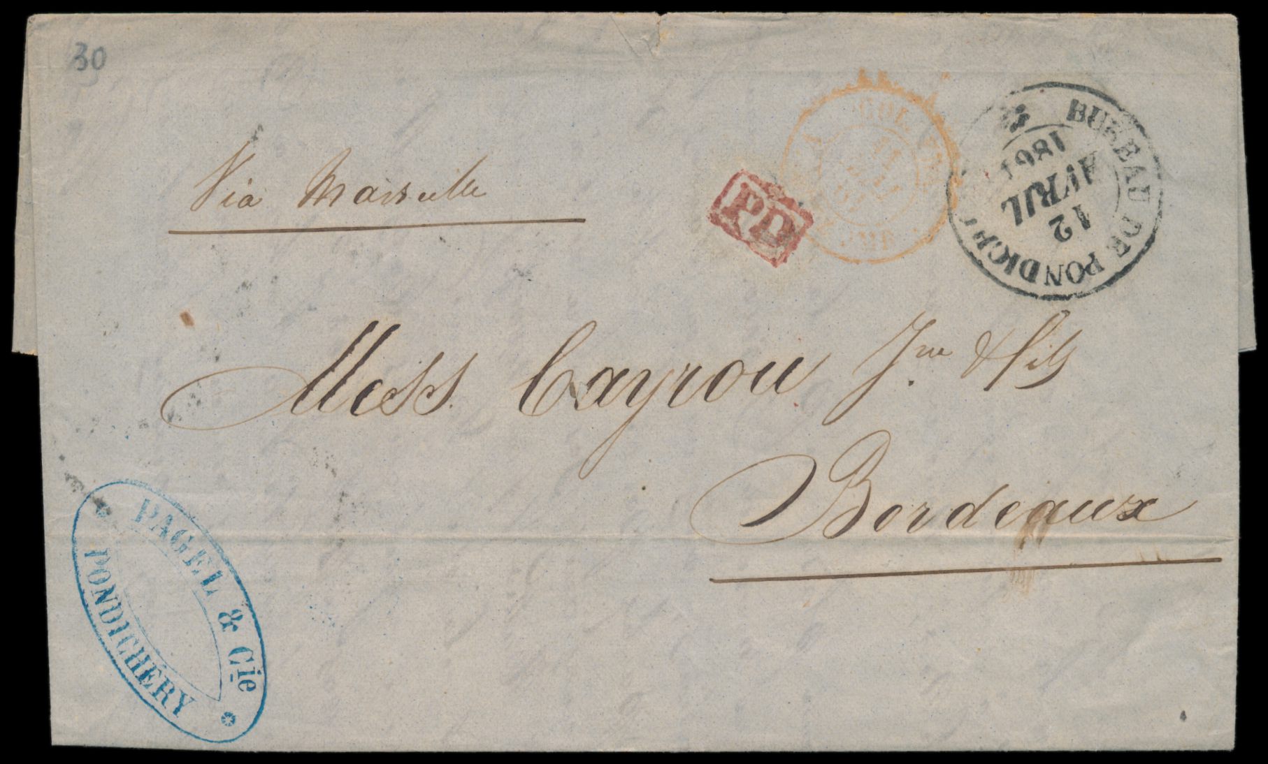 Französisch-Indien, Stempel Bureau de Pondichery 12.4.1861 auf Faltbrief nach Bordeaux, roter Stempel PD, Absenderstempel "Pagel & Cie.", roter Durchgangsstempel Col. Fra. ... 11.5.61, Ankunftsstempel 12.5.61, mit komplettem Inhalt