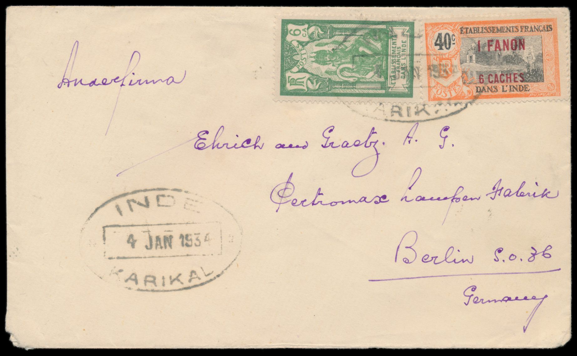 Französisch-Indien, 1 fa 6 ca auf 40 C. (1923) und 6 ca (1929) auf Brief mit Ovalstempel Inde / Karikal 4.1.1934 nach Berlin, Bedarf