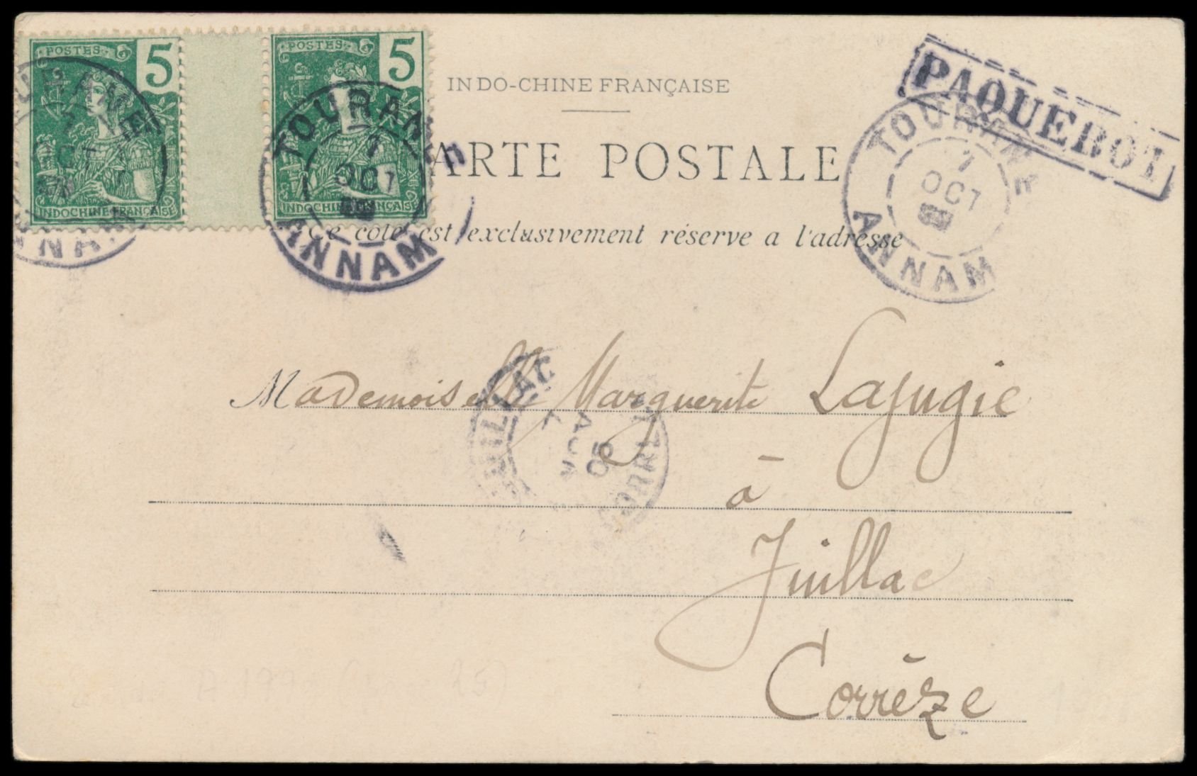 Indochina, Zwischensteg-Paar 5 C. auf Ansichtskarte nach Frankreich, Stempel Tourane / Annam 7.10.05 und R1 Paquebot, Ankunftsstempel Juillac 7.11.05