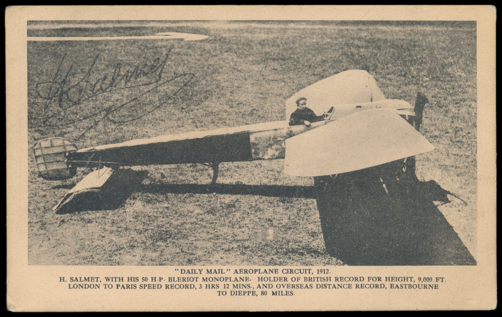 Henri Salmet, französischer Flugpionier (1778 - 1954), Unterschrift bildseitig auf englischer Ansichtskarte "Daily Mail" Aeroplane Circuit 1912 - H. Salmet with his 50 H. P. Bleriot Monoplane ...", ungelaufen