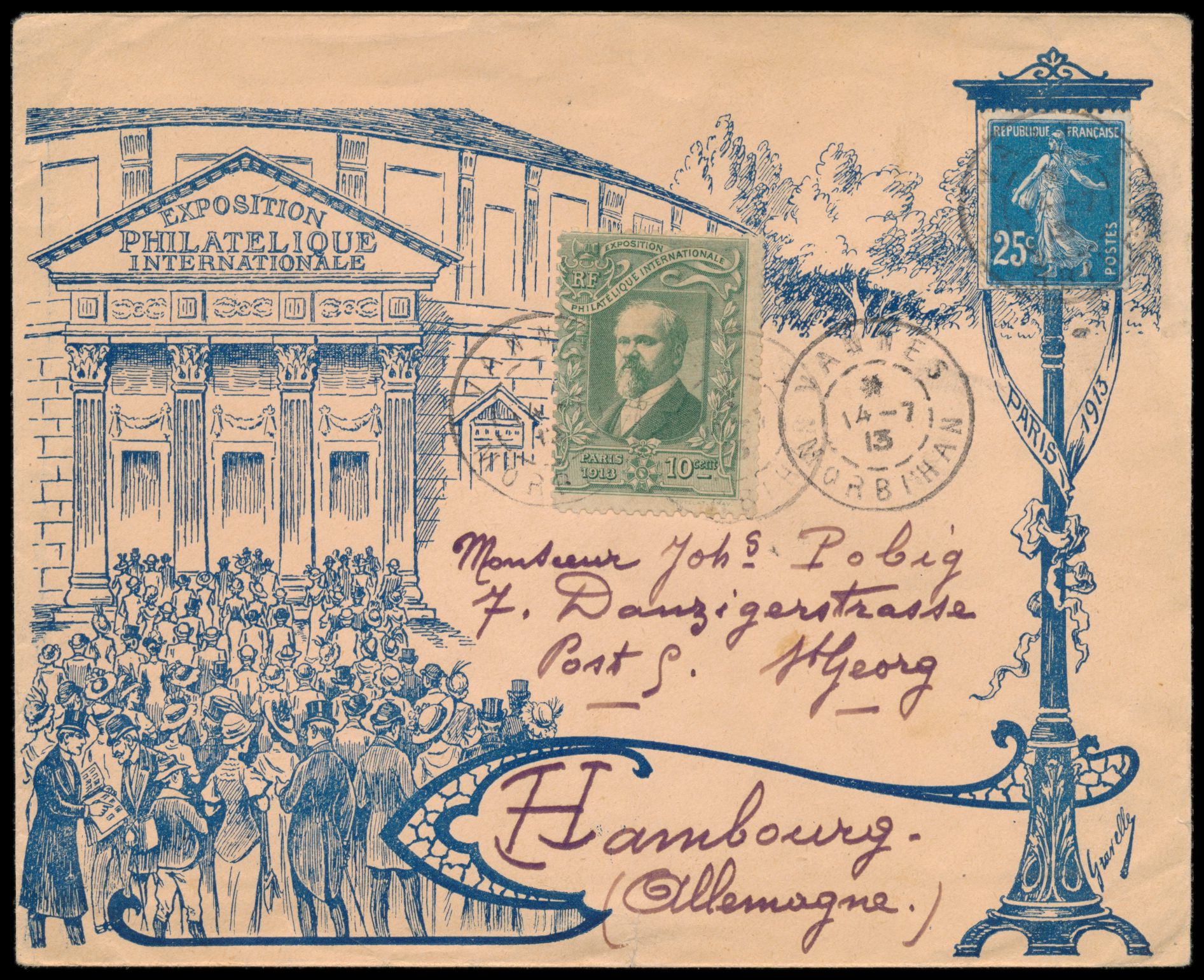 dekorativer Bildumschlag "Exposition Philatelique Internationale Paris 1913" mit Spendenmarke 10 C. grün und Frankatur 25 C. nach Deutschland, Stempel Vannes / Morbihan 14.7.13