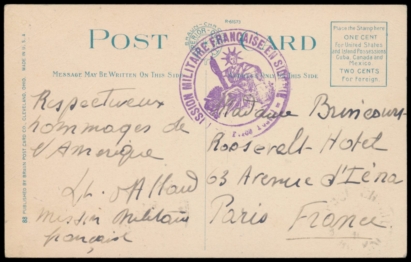 12.11.1918 bis Mai 1920: USA-Ansichtskarte Cleveland / Ohio mit Dienstsiegel Mission Militaire Francaise en Siberie / Franchise Postal nach Paris, seltener Beleg vom Bahntransport durch die USA von New York über Cleveland, Chicago und Omaha nach San Francisco, von dort per Schiff nach Wladiwostok (Ankunft dort am 6.3.1919)