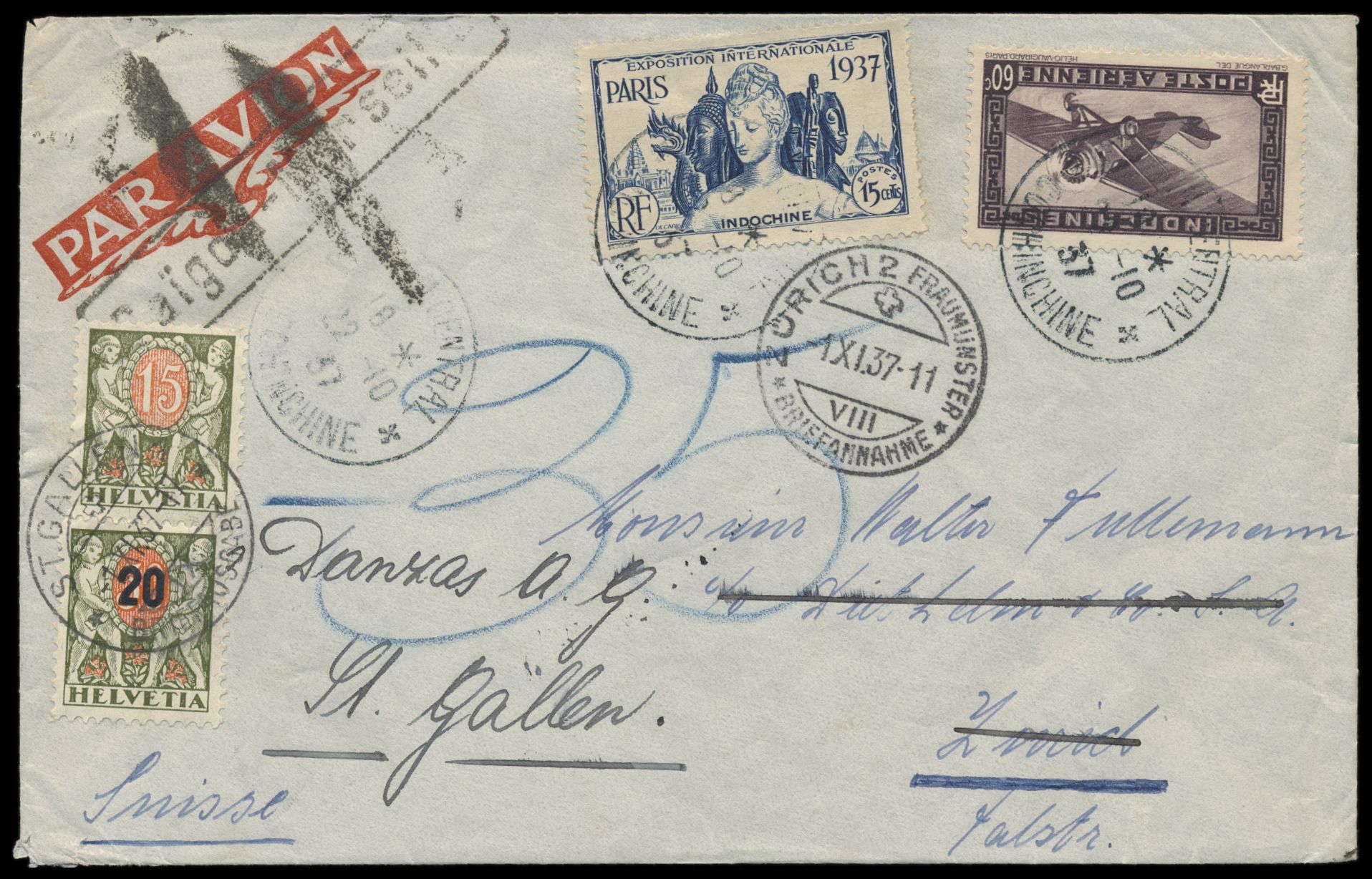 Indochina, 15 C. und 60 C. auf Luftpostbrief Saigon 20.10.37 in die Schweiz, Ankunftsstempel Zürich 1.11.37, weiter nach St. Gallen, dort 2 Portomarken, Stempel St. Gallen 1.11.