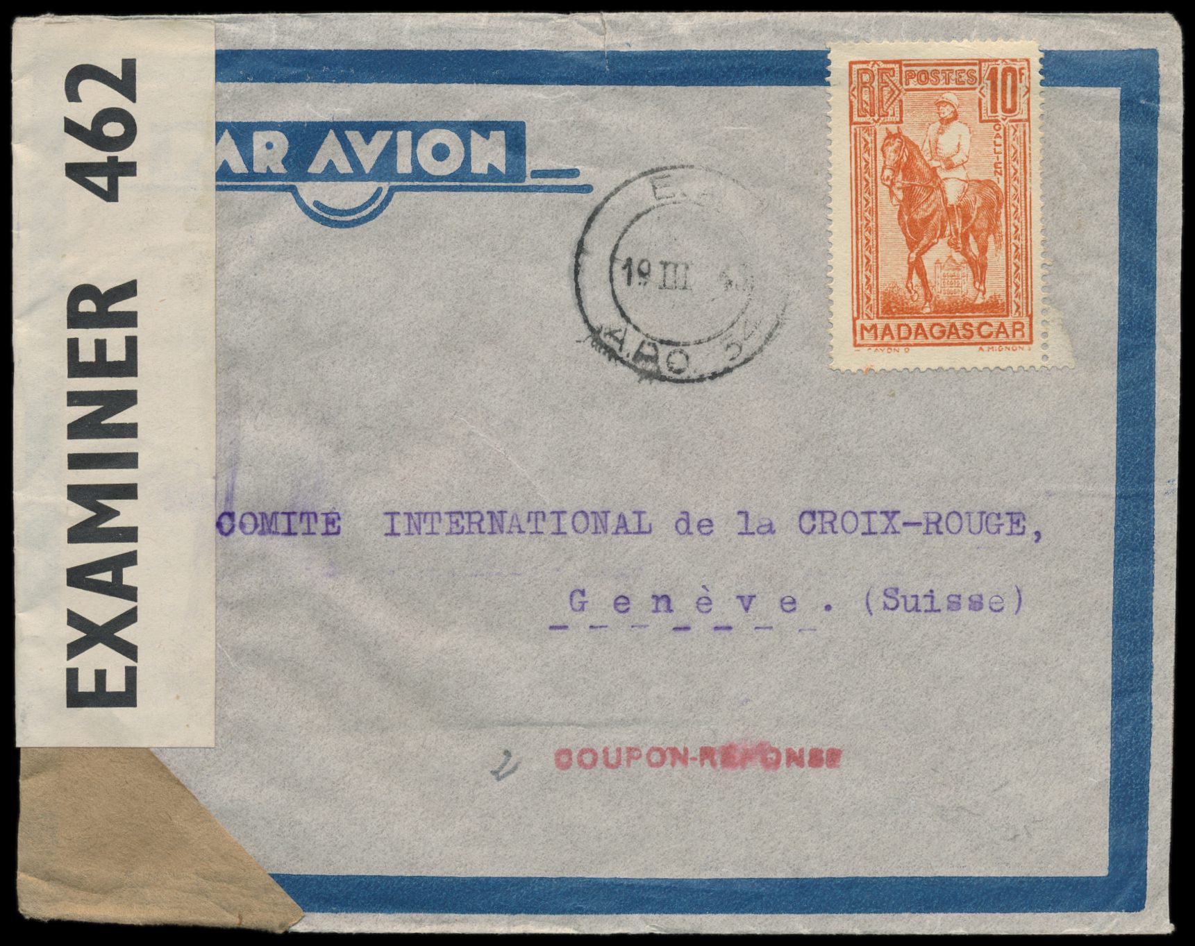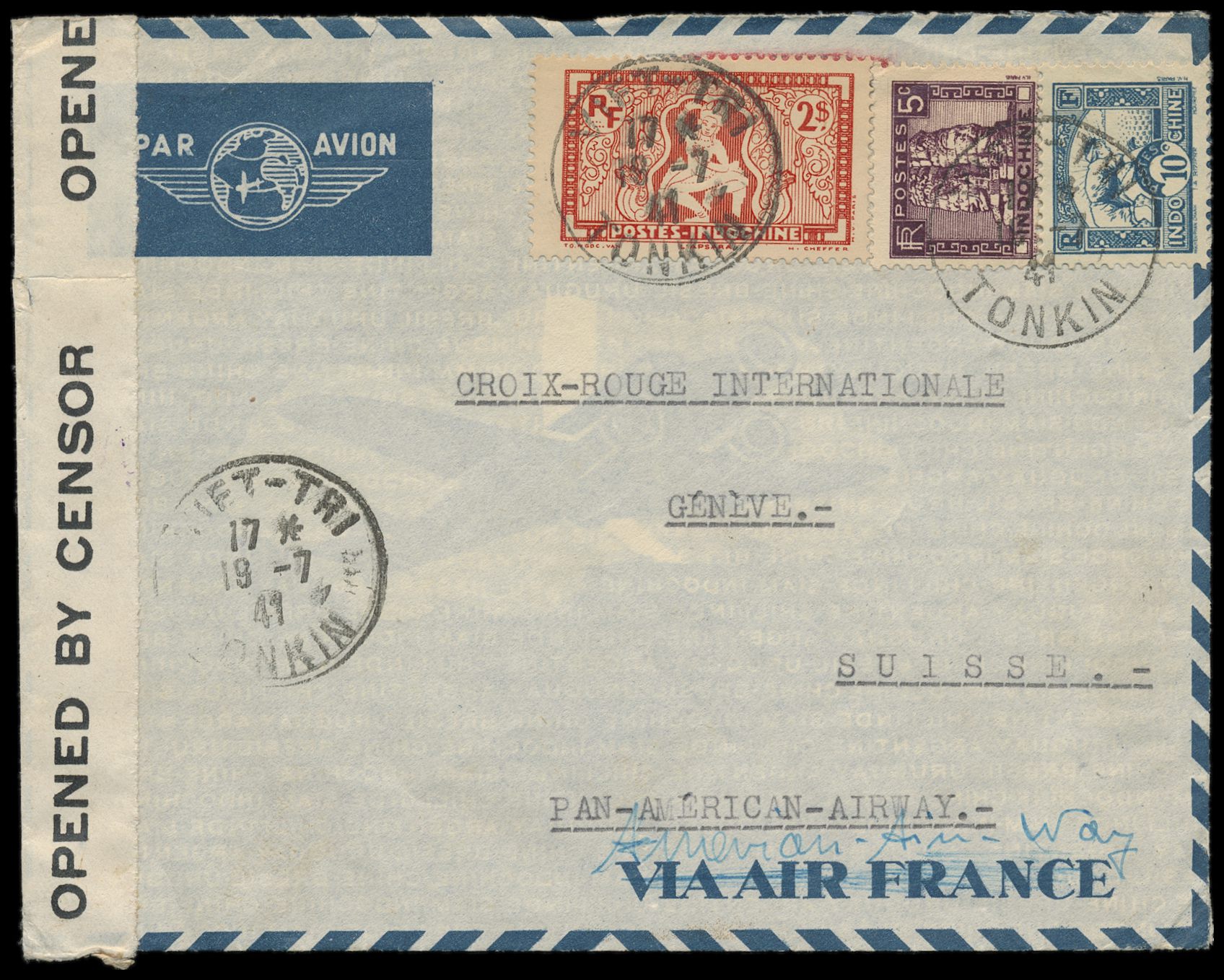 Indochina, 5 C., 10 C. und 2 $ auf Luftpostbrief Air France, Stempel Viet-Tri (Tonkin) 19.7.41 in die Schweiz, Transitstempel Hanoi, Zensurverschluß mit Zensorstempel 133