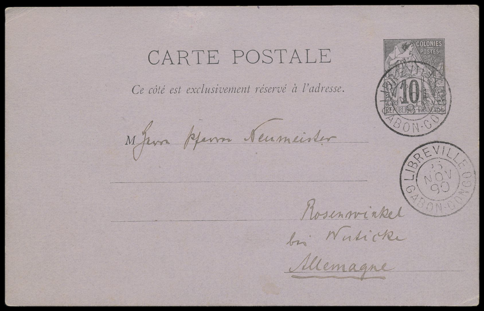 Gabun, Ganzsache Colonies Postes 10 C. mit Stempel Libreville Gabon Congo 25.11.90, Bedarf nach Deutschland