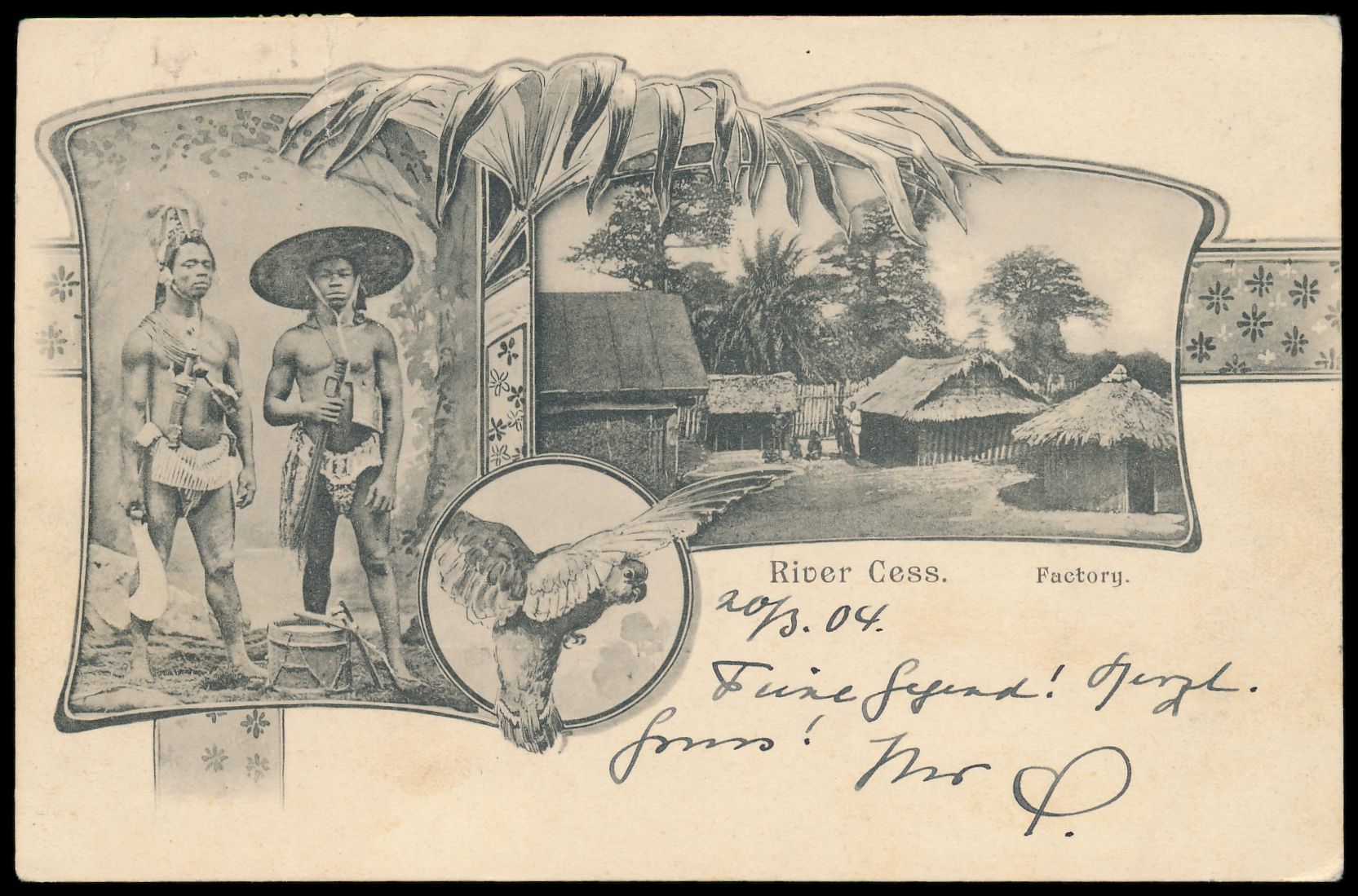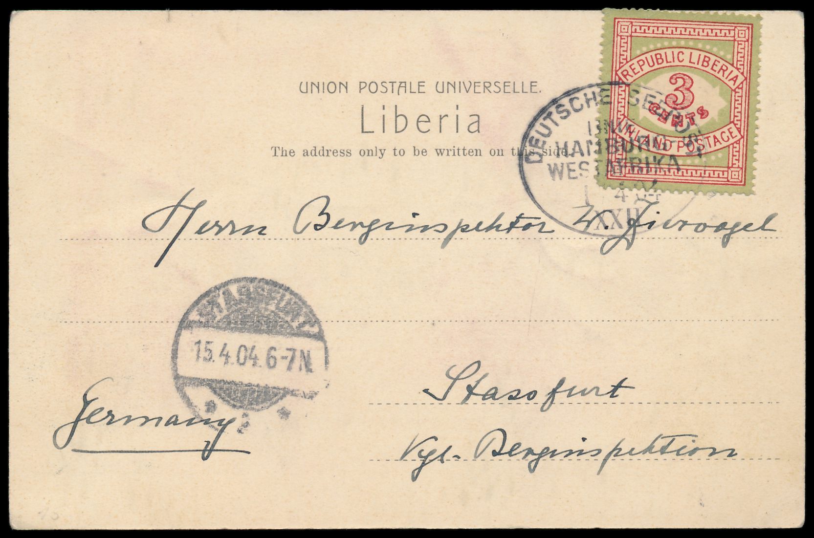 Liberia 3 C. auf Ansichtskarte River Cess mit Stempel Deutsche Seepost Linie Hamburg - Westafrika XXII 1.4.04, Dampfer Ernst Woermann, nach Deutschland, Ankunftstempel Stassfurt 15.4.04, Bedarf