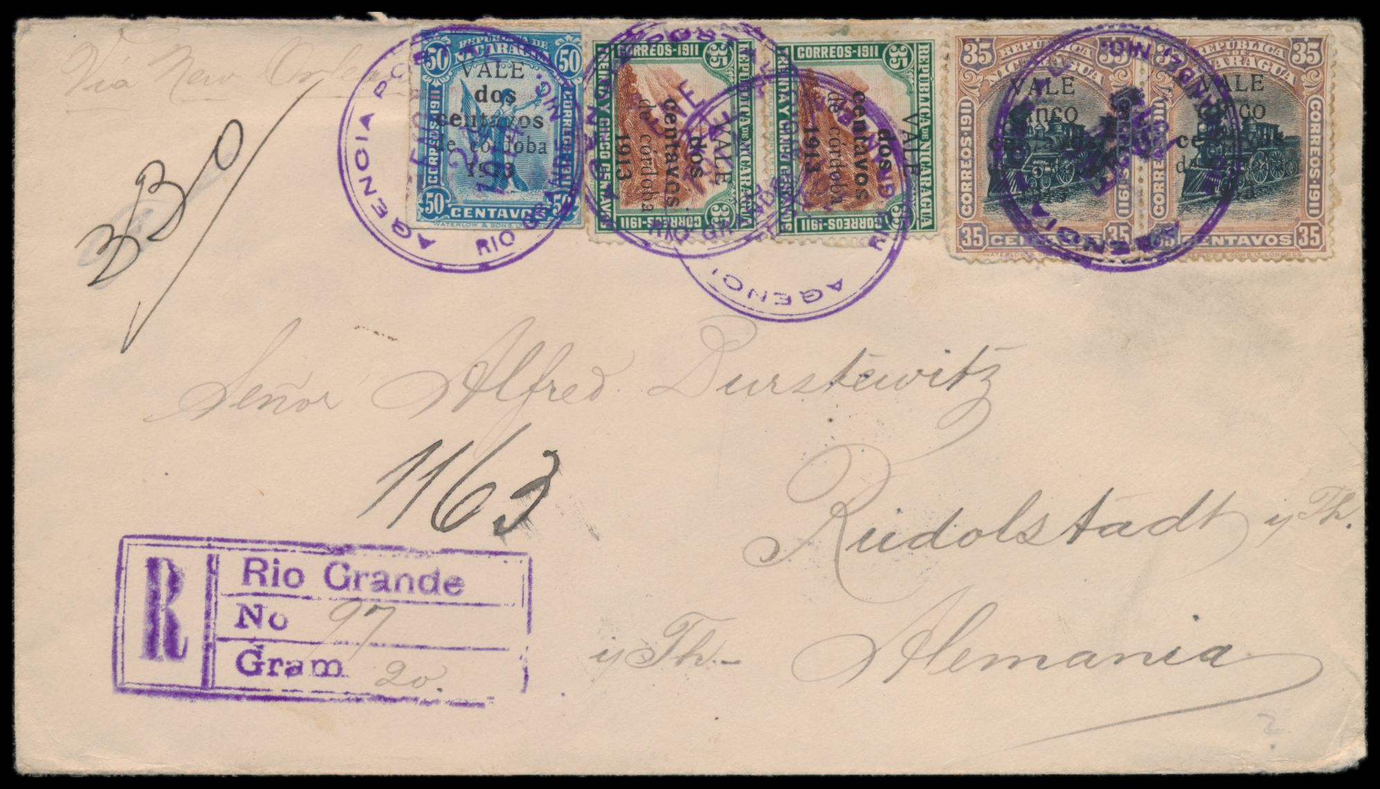 Einschreibbrief mit Aufdruckausgabe 1913: 2 C. auf 50 C. (Mängel), 2 x 2 C. auf 35 C. und 2 x 5 C. auf 35 C. nach Deutschland, Stempel Rio Grande 24.1.1914, violetter R-Stempel, Durchgangsstempel New Orleans 5.2.1914 und New York 8.2.1914, Ankunftstempel Rudolstadt 18.2.14, Bedarf