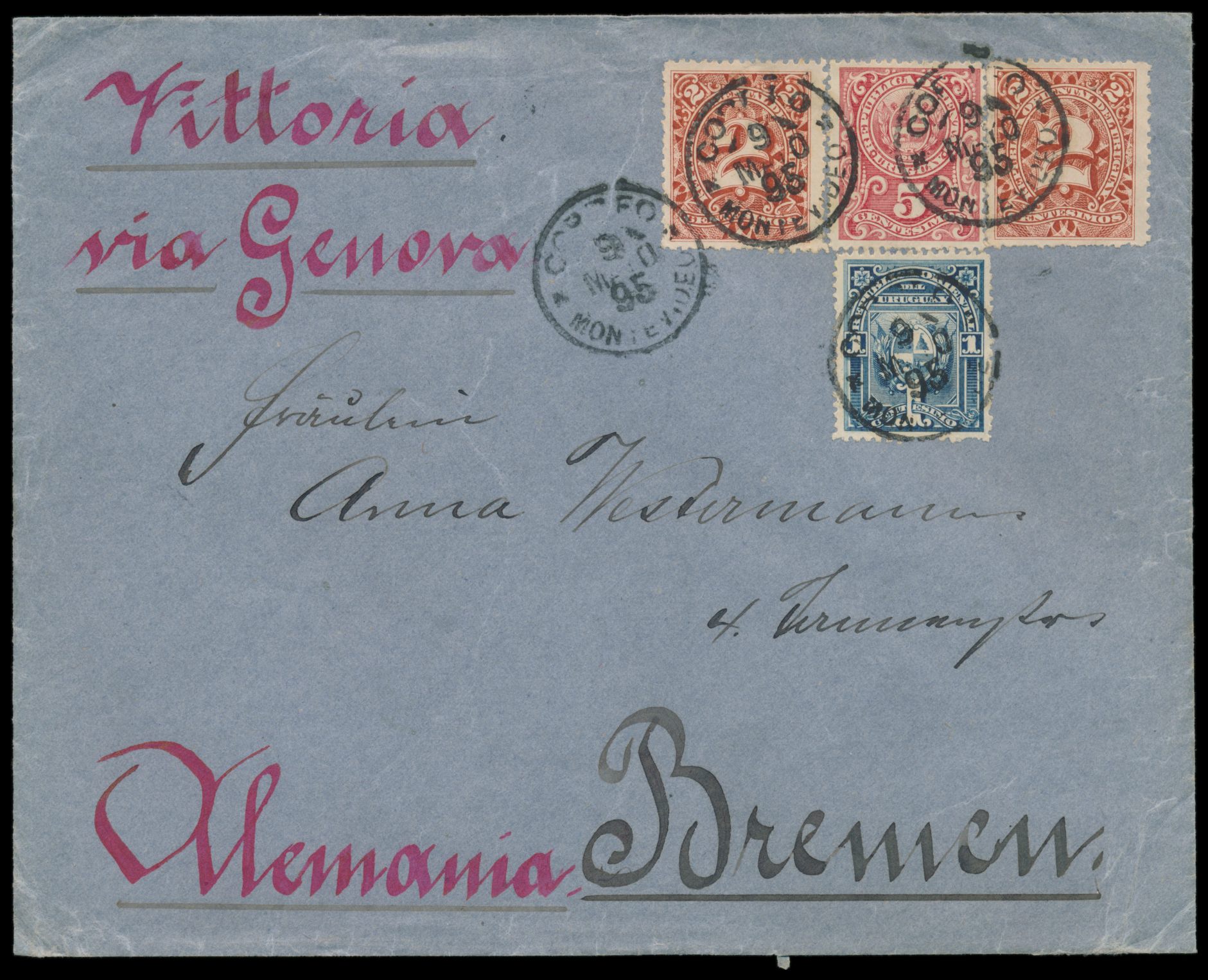 Ausgabe 1894: 1 C., 2 x 2 C. und 5 C. auf Brief mit Stempel Montevideo 9.5.95 nach Deutschland, Ankunftstempel Bremen 31.5.95