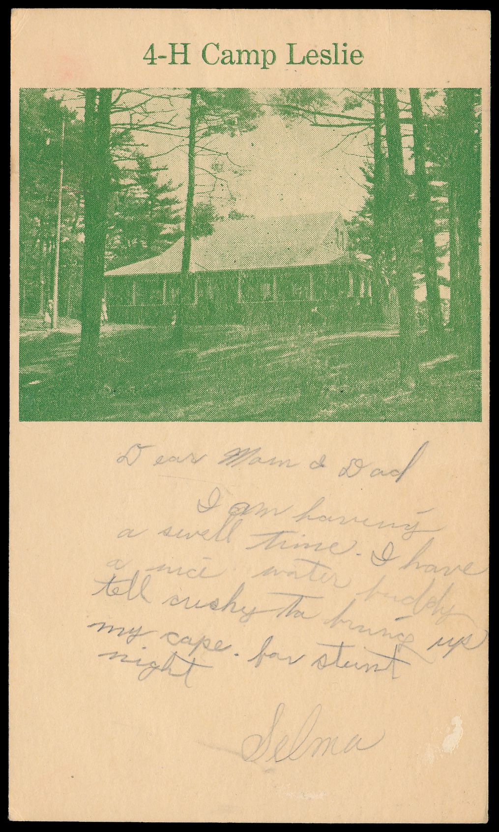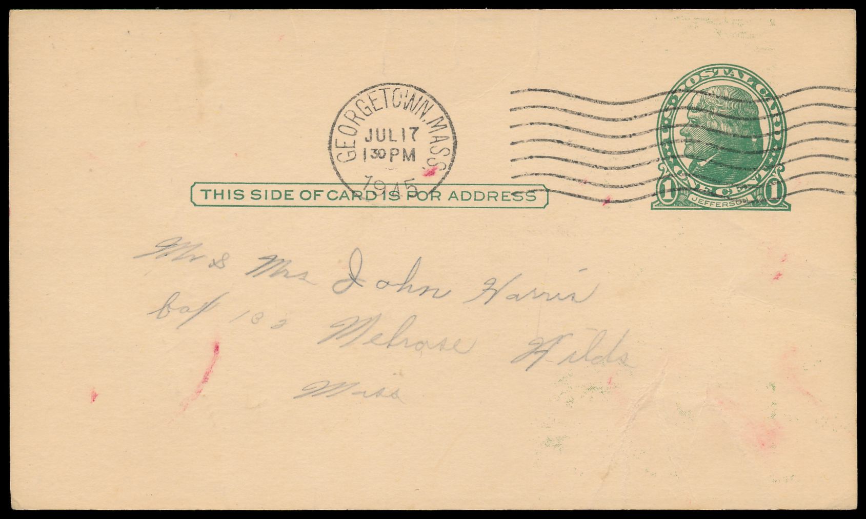 Ganzsache 1 C. Jefferson, rückseitig zugedrucktes grünes Bild "4-H Camp Leslie" , Maschinenstempel Georgetown, Mass. 17.7.1945