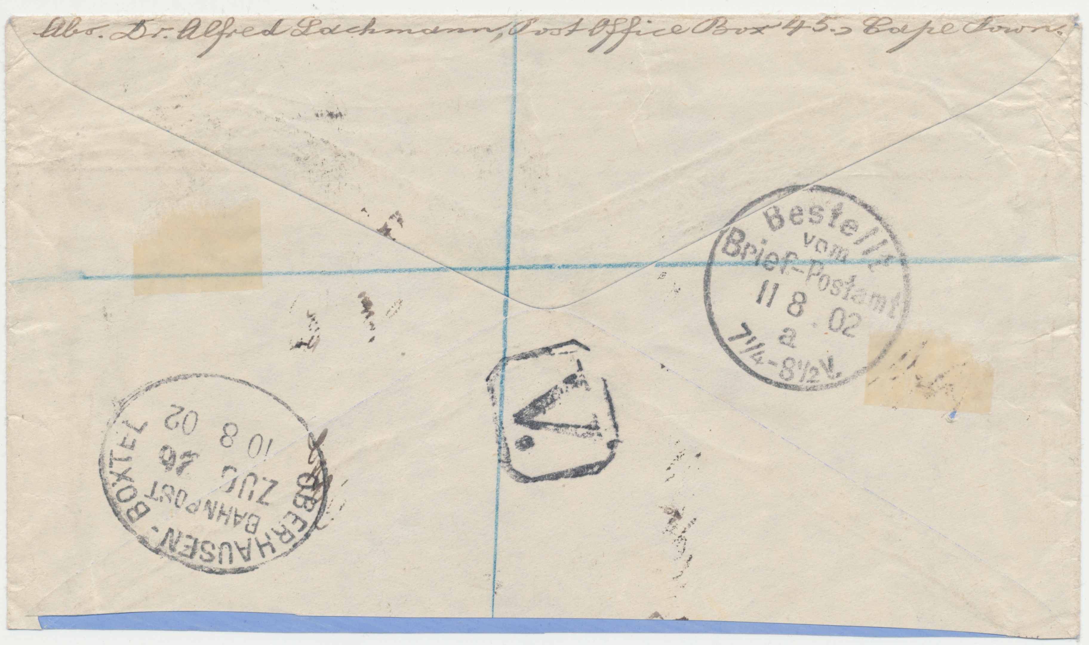Kap der Guten Hoffnung 6 d. (1884) und 3 d. (1896) auf Einschreibbrief mit Stempel Registered Cape Town 22.7.02 nach Berlin, rückseitig Bahnpoststempel Oberhausen - Boxtel Zug 26 10.8.02, R-Zettel "Vom Auslande über Bahnpost 15" , Ankunftstempel 11.8.02