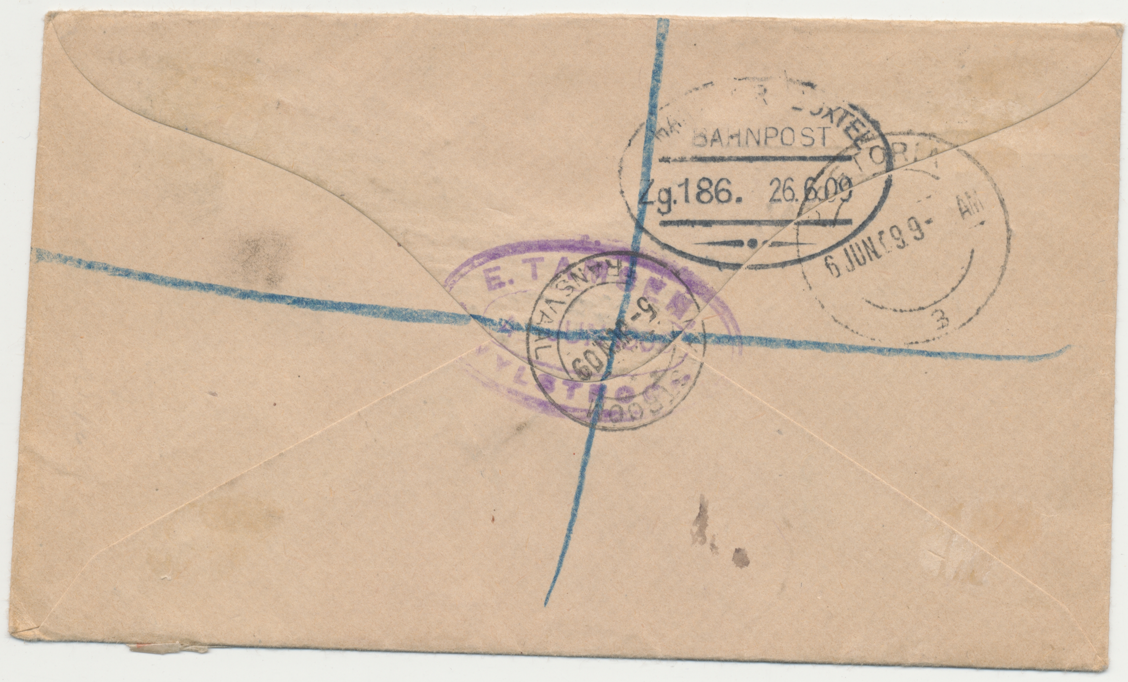 Transvaal 1 d. (Viererblock) und 2 1/2 d. auf Einschreibbrief mit Stempel Nylstroom 5.6.09 nach Deutschland, Durchgangstempel Pretoria 6.6.09 und Bahnpoststempel Hannover - Boxtel Zg. 186 26.6.09, R-Zettel "Vom Auslande über Bahnp. 15"
