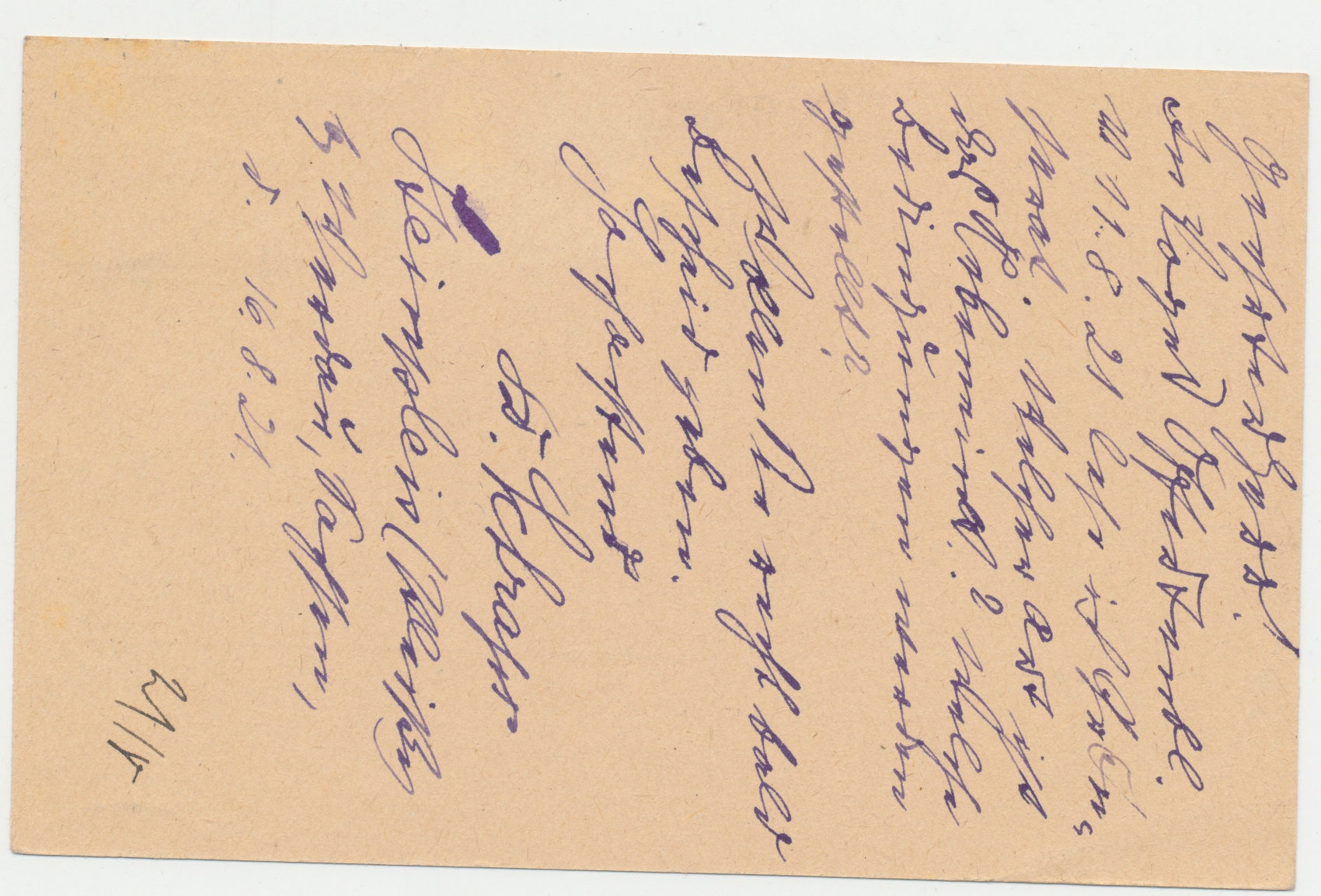 Einzelfrankatur 50 Pf. auf Postkarte mit Stempel Werdau 2 17.8.21 an Postlagerkarte 290 in Dresden A. 1, Postlagergebühr 10 Pf. bereits frankiert, deshalb irrtümlich erhobene Nachgebühr 10 Pf. wieder gestrichen, gestempelte Lagerfrist 1.9.21, Bedarf. Belege mit vorausbezahlter Lagergebühr sind selten