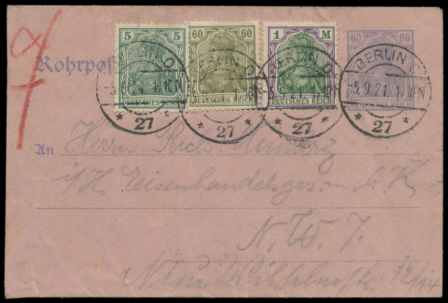 Ganzsachen-Umschlag 60 Pfg. Germania mit Zusatzfrankatur 5 und 60 Pfg. und 1 Mk. Germania portorichtig, Stempel C 27 5.9.21, Ankunftstempel NW 7