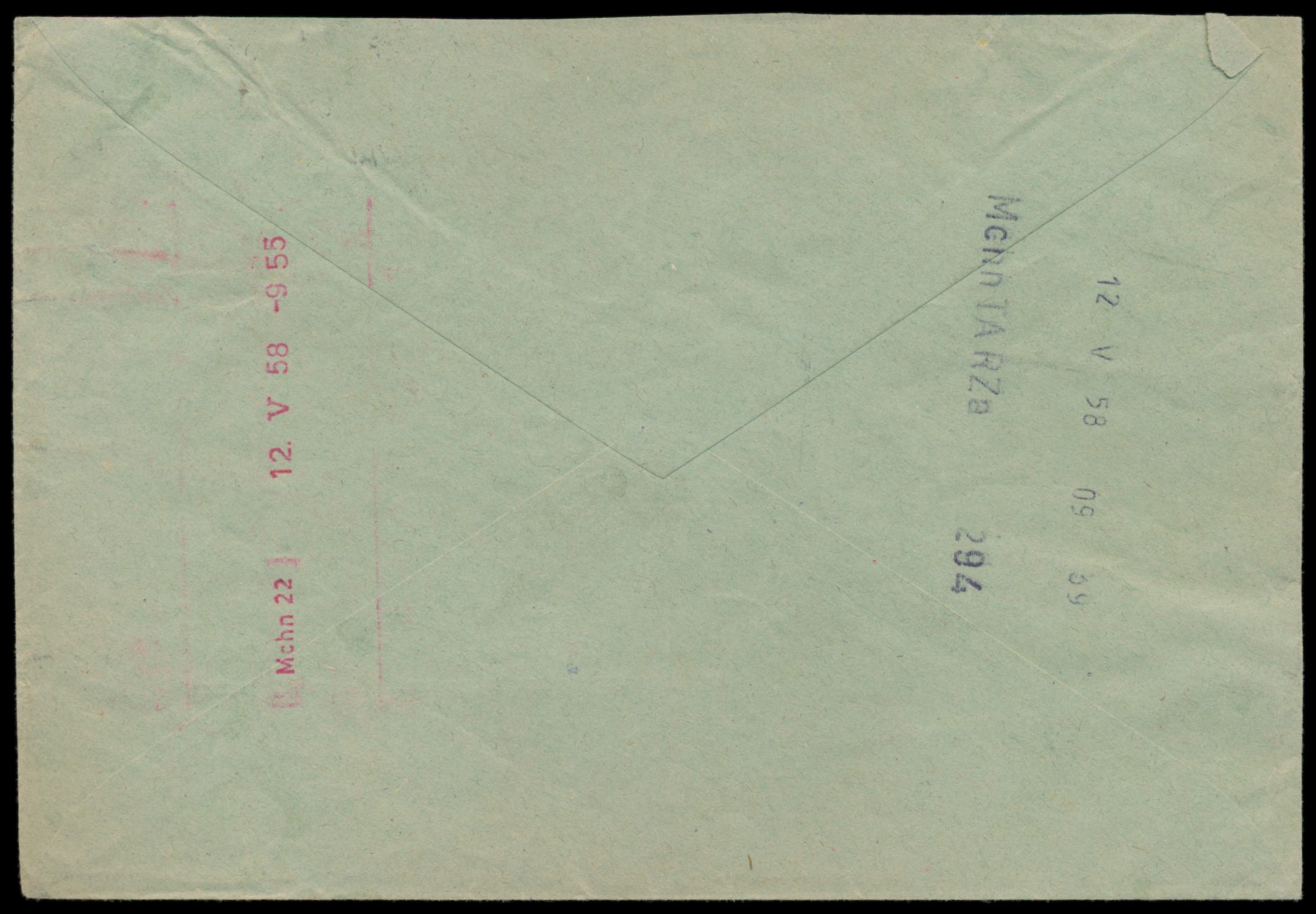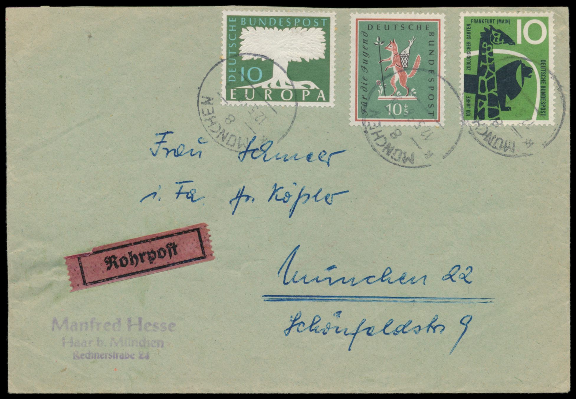 Rohrpost-Ortsbrief mit Stempel München 8 12.5.58, frankiert mit drei Sondermarken zu 10 Pf. (Porto 30 Pf.), rückseitig roter Stechuhrstempel Mchn 22 und violetter Stechuhrstempel Mchn TA RZa