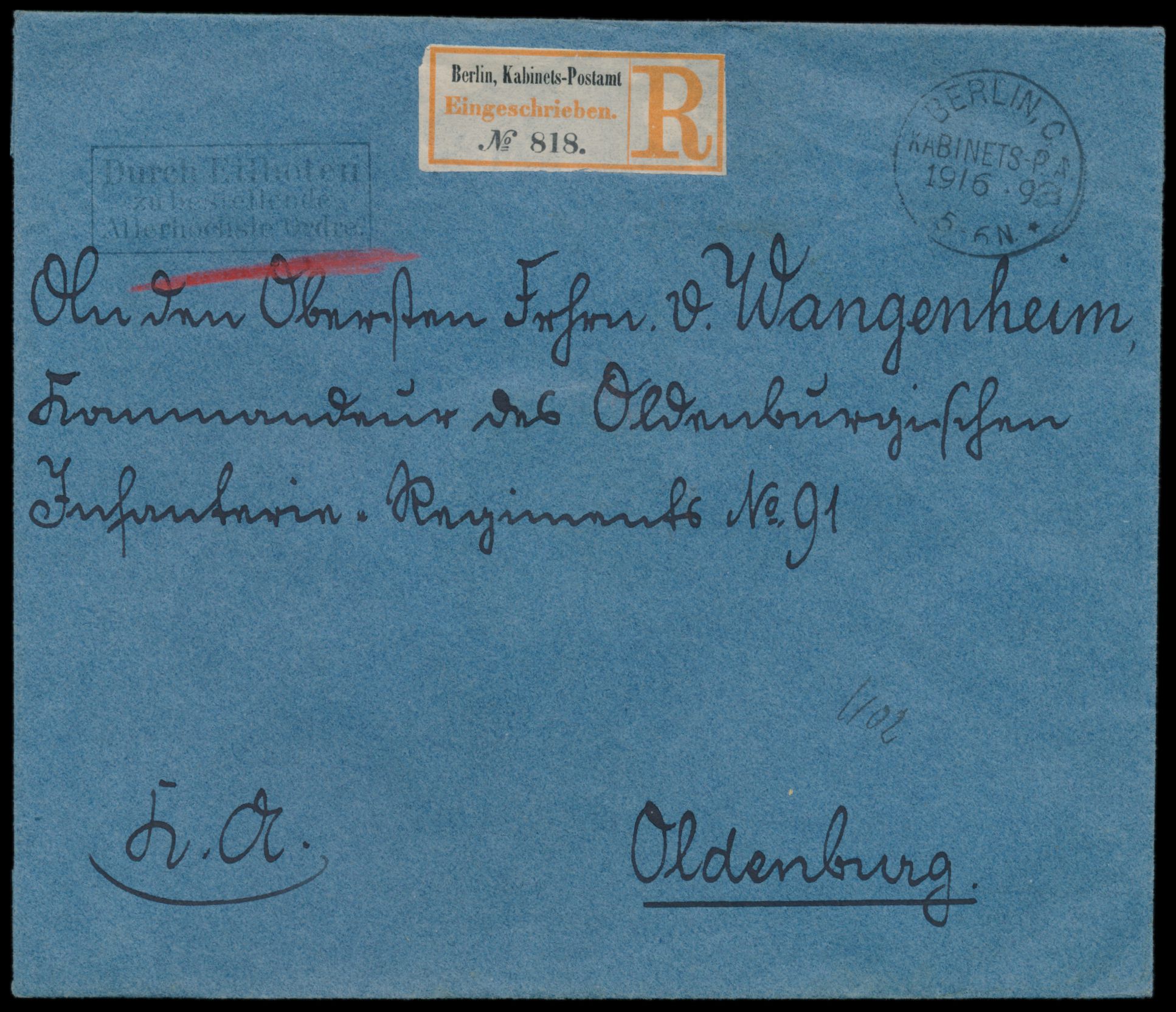 Stempel Berlin, C Kabinets-P.A. 19.6.93 auf gesiegeltem blauem Briefumschlag als Einschreiben und Eilboten an den Obersten Freiherrn v. Wangenheim ... Oldenburg, Portofreiheitsvermerk "K.A.", Ankunftstempel 20.6.93