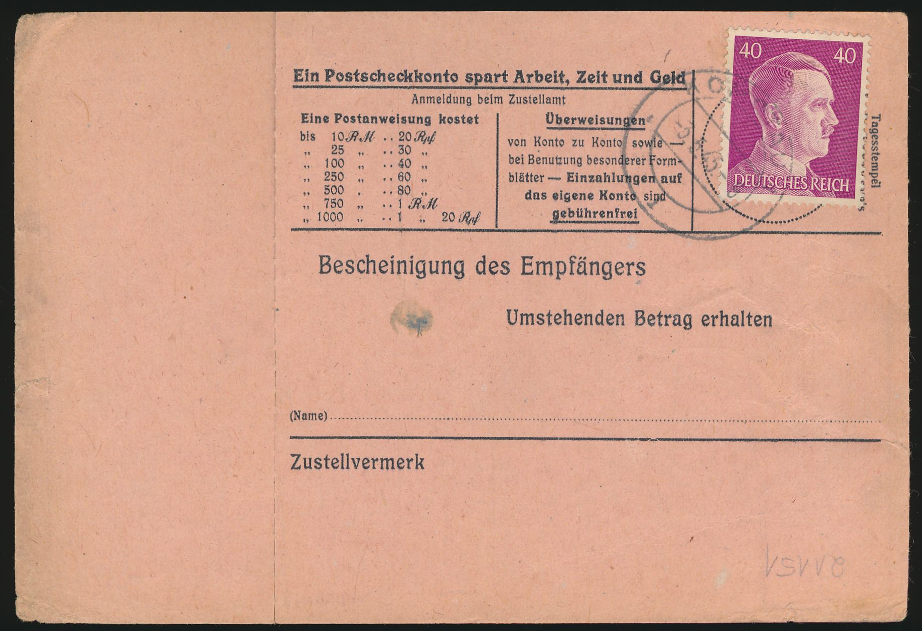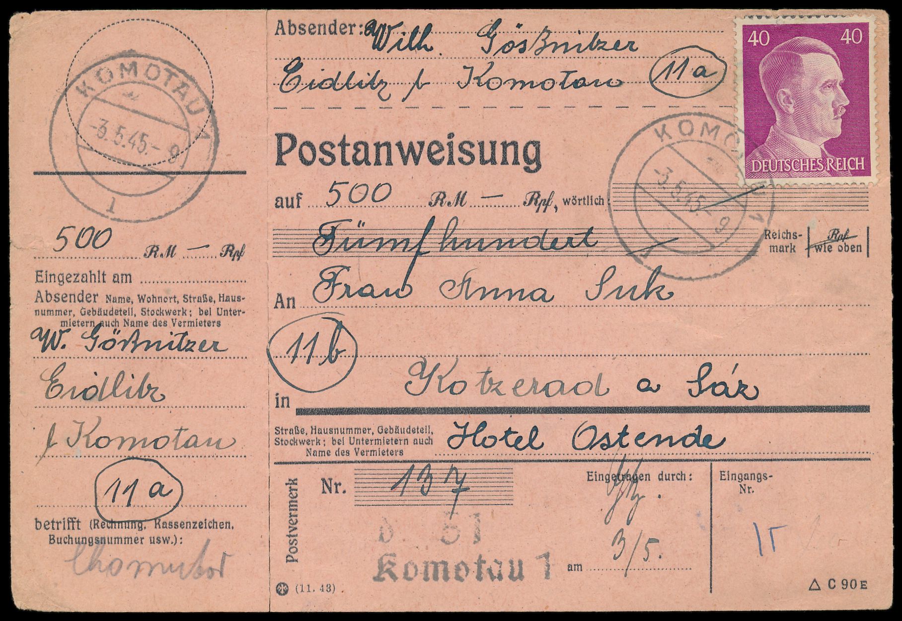 2 x 40 Pf. Hitler (1 x rückseitig) auf Postanweisung auf 500 RM mit Stempel Komotau 1 3.5.45 nach (11b) Kotzerad, seltenes spätes Datum, ohne Ankunftstempel, nicht mehr ausgezahlt, Coupon abgetrennt (liegt lose bei)