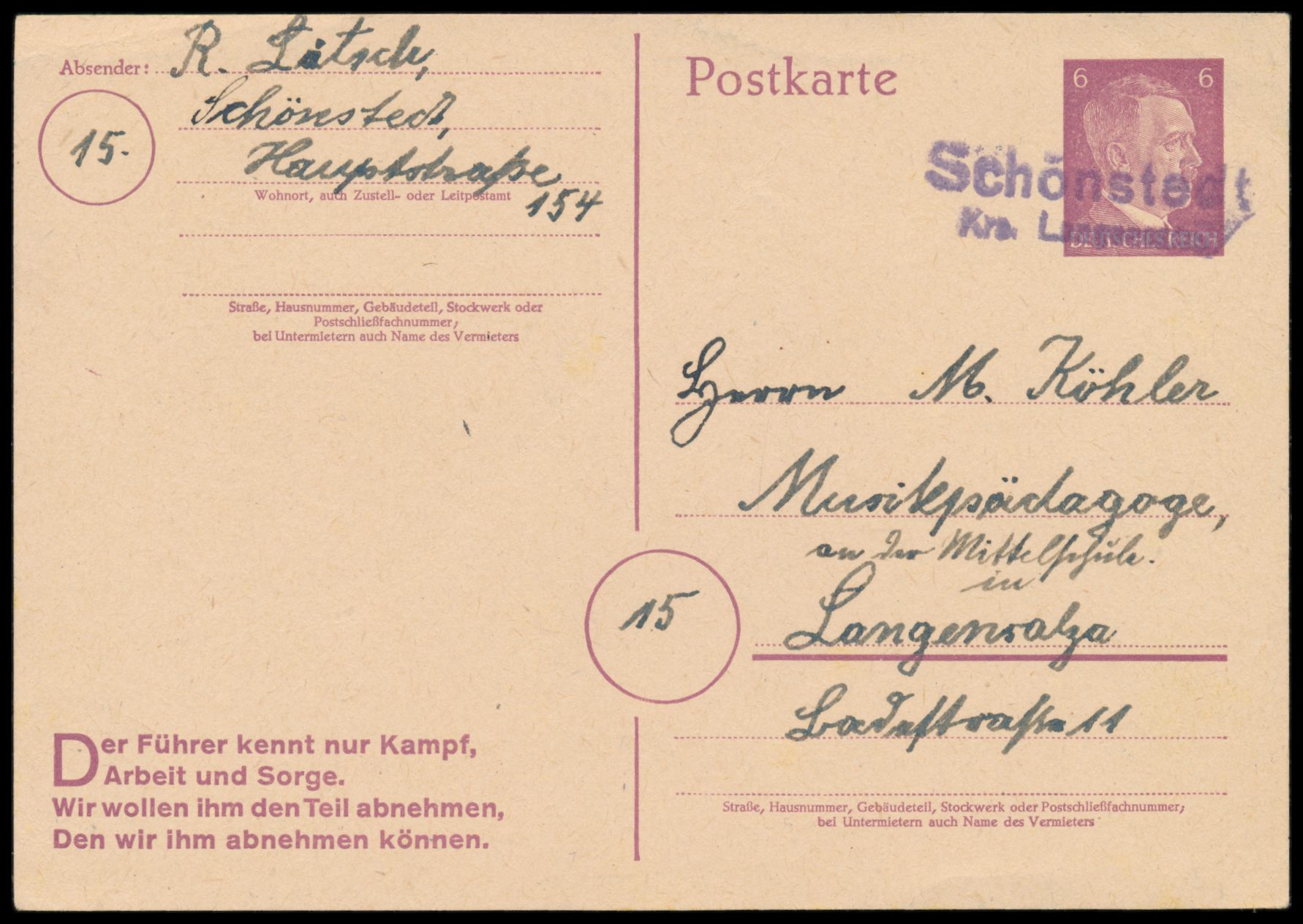 Hitler-Ganzsache 6 Pf. mit violettem Not-L2 Schönstedt / Krs. Langensalza nach Langensalza, rückseitig datiert 10.1.1945, Bedarf, Abbildungsstück im Handbuch von Richter / Spilker