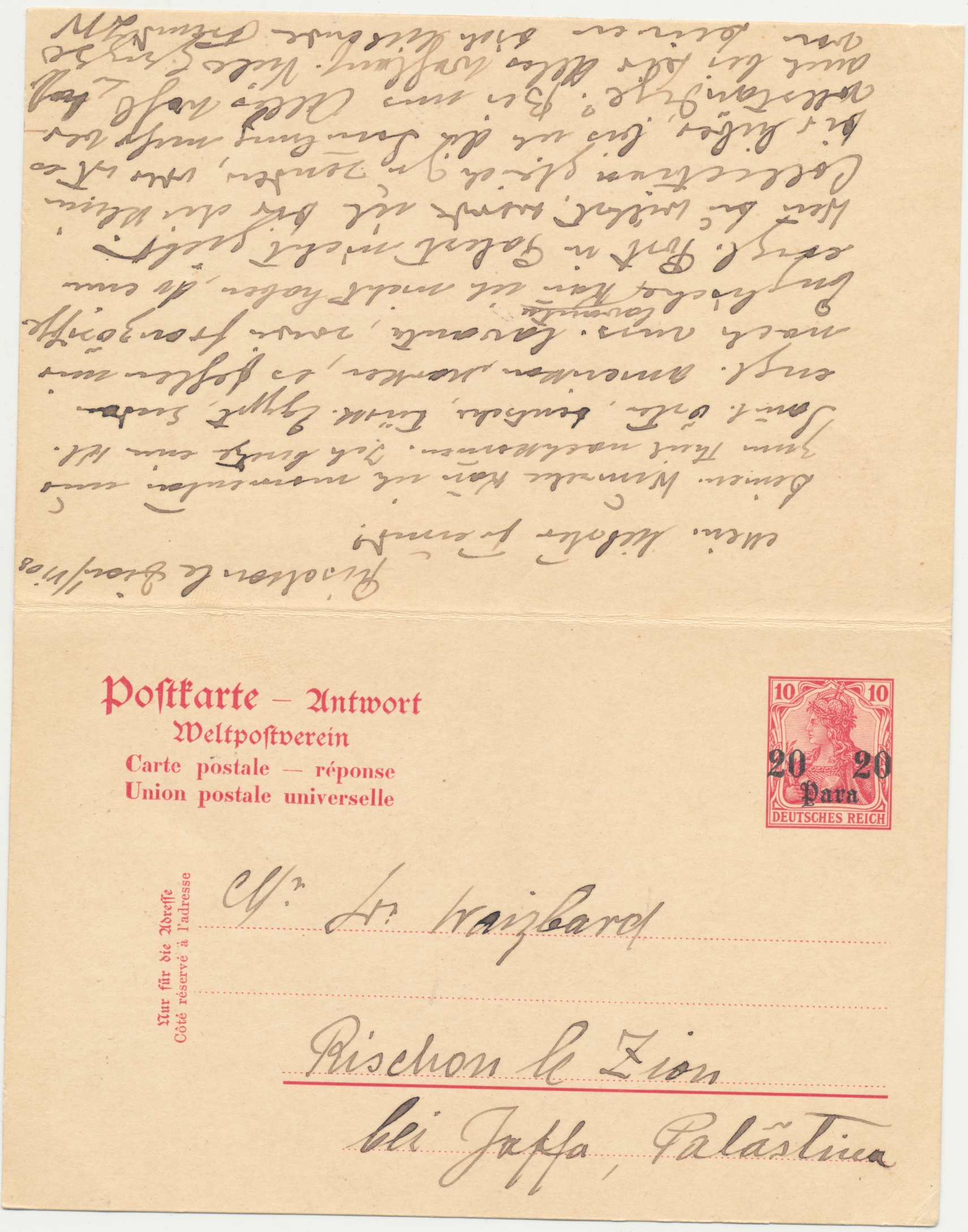 Ganzsachen-Doppelkarte 20 Para mit Stempel Jaffa 2.6.08 nach Görz / Österreich, geschrieben in Rishon le Zion, langer Bedarfstext, Antwortteil hängt ungebraucht an