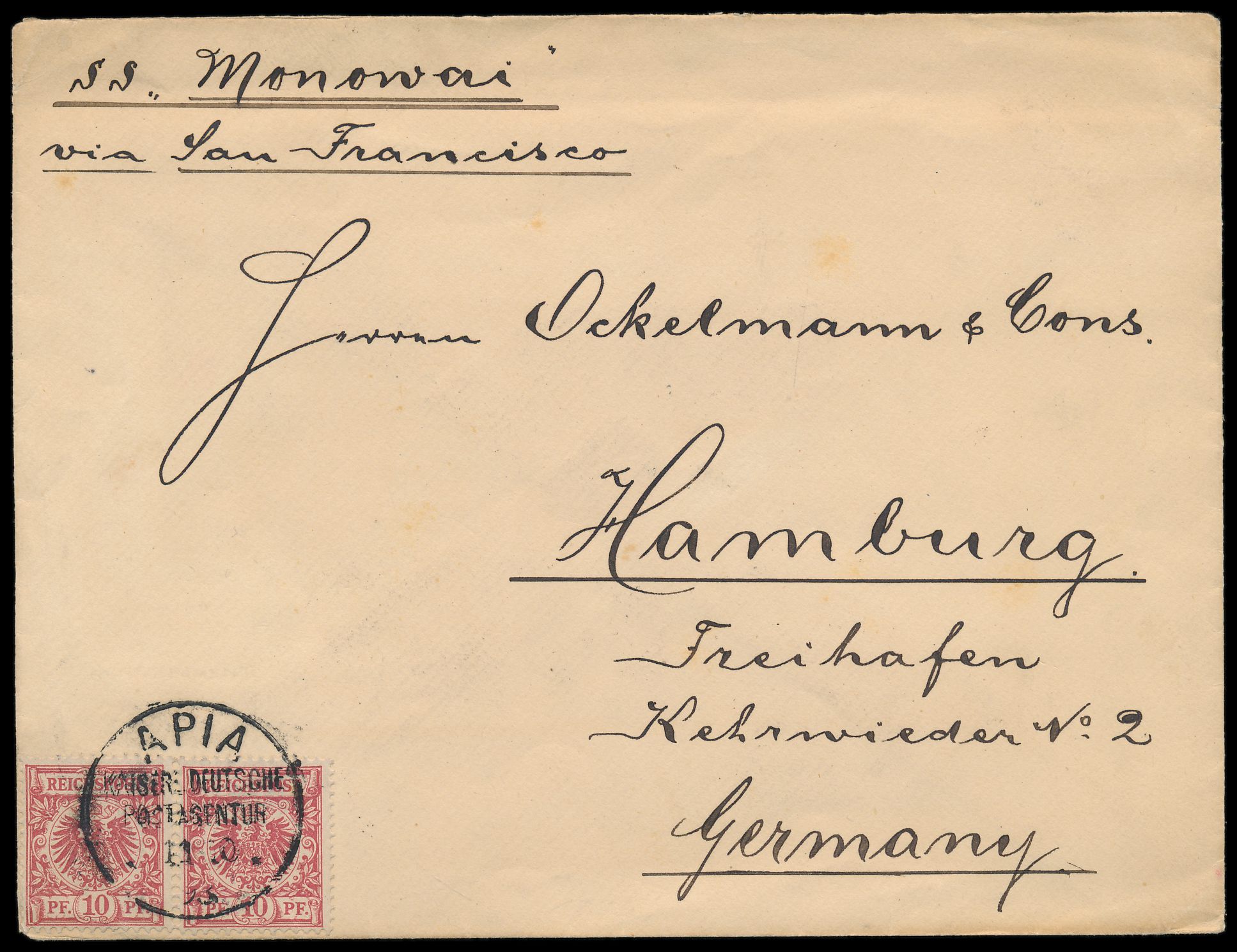 2 x Vorläufer 10 Pf. auf Brief mit Stempel Apia KDPAg 11.10.93 nach Hamburg, Leitvermerk "S.S. Monowai via San Francisco", Ankunftstempel 10.11.93