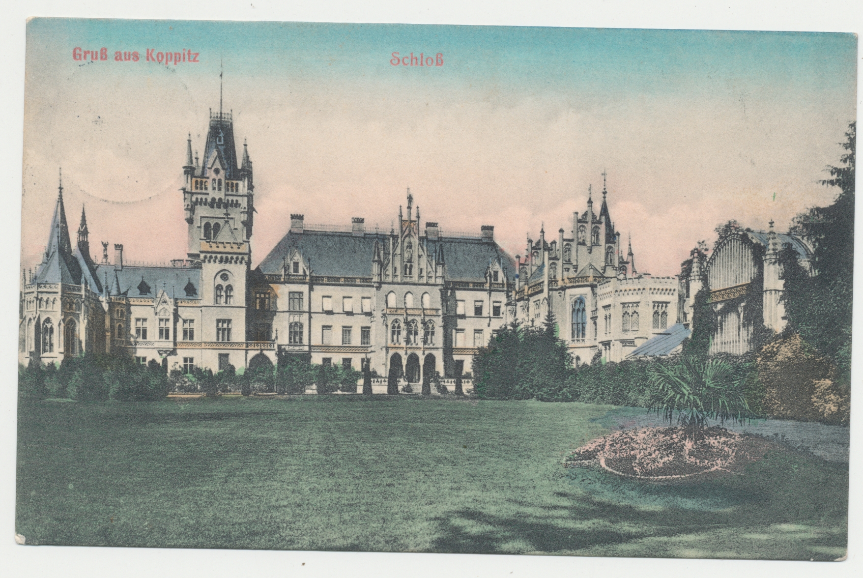 umgearbeiteter  Preußen-K2 Koppitz  28.8.11 (Uhrzeitangabe hinzugefügt) auf kolorierter Ansichtskarte Schloss Koppitz nach Berlin, Bedarf