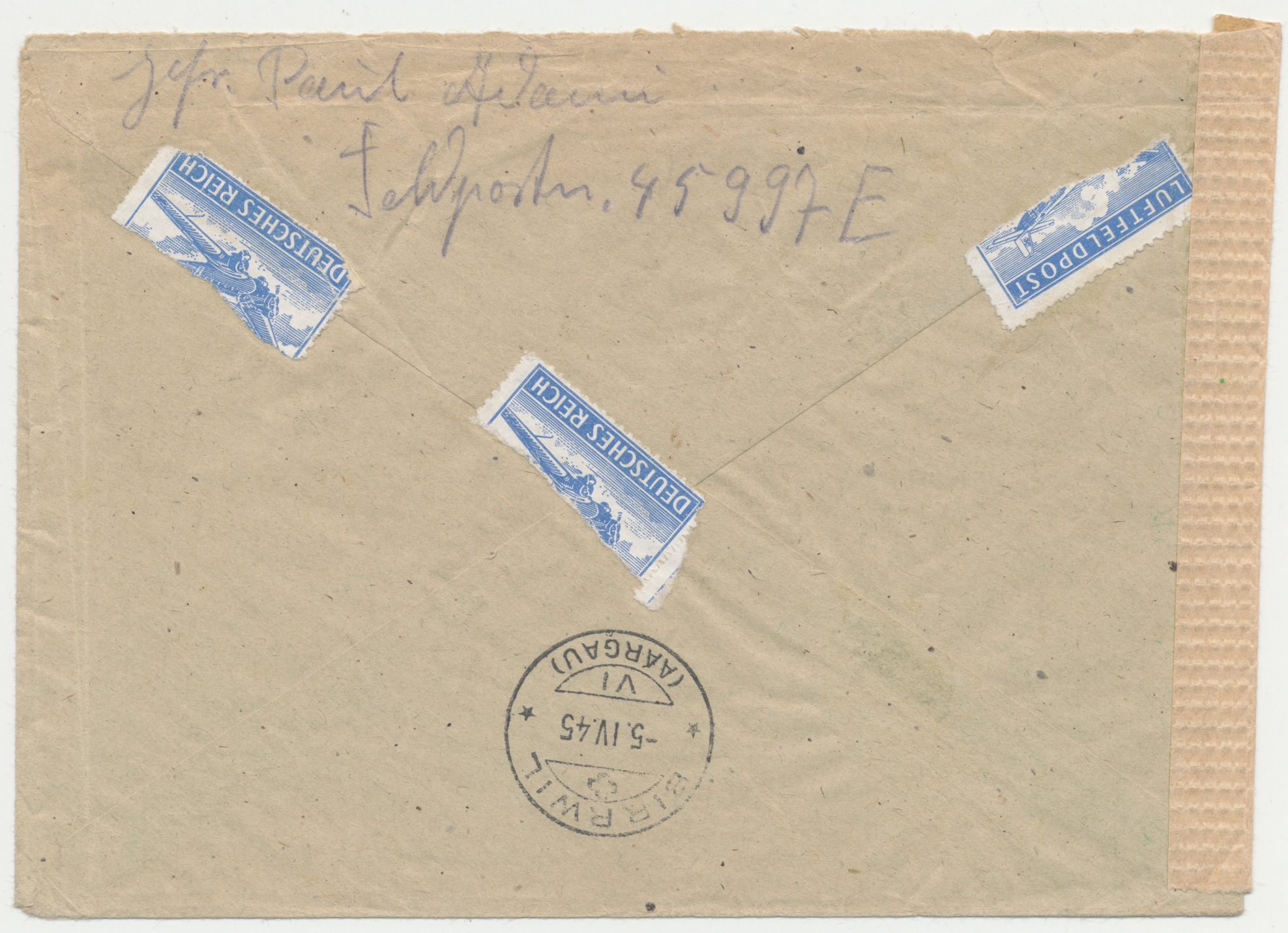 Seebrückenkopf Memel,  seltener  Auslands-Feldpostbrief in die Schweiz  (Namensgleichheit von Absender und Empfänger), FPSt e 15.1.45, handschriftlicher Absender ... FPNr. 45997 E = 4. Kompanie  Festungs-MG-Bataillon 32  (Festungs-Regiment Memel), Zensur München (neutraler Verschluss mit grünem Maschinenstempel der Briefverschlussvorrichtung und zusätzlich Durchlaufstempel Ad), Ankunftstempel Birwil (Aargau) 5.4.45, seltener später Beleg aus der seit 10.10.1944 von allen Landverbindungen abgeschnittenen  Festung Memel  (Räumung bis 28.1.1945)
