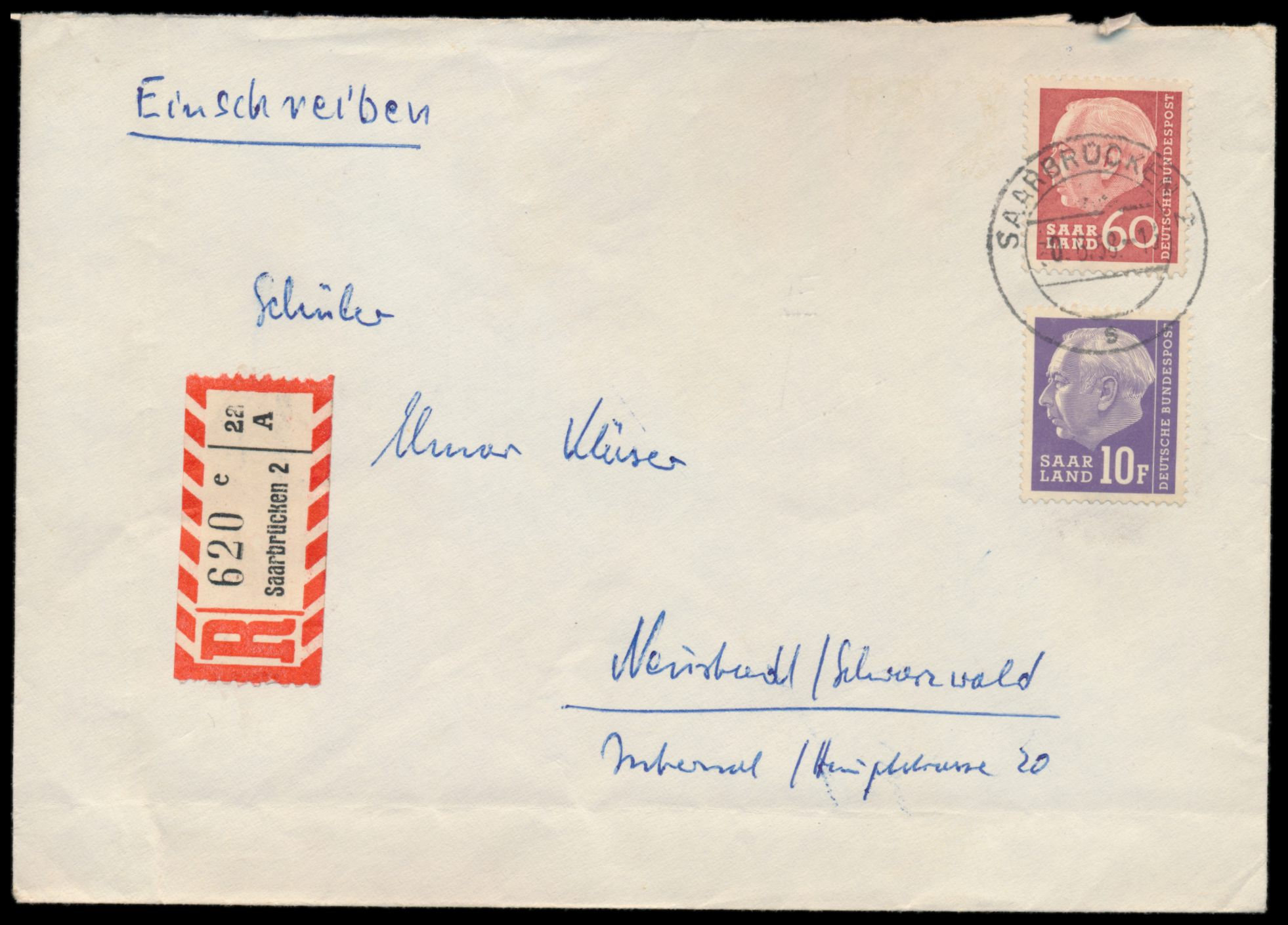 Mischfrankatur  60 (F) Heuss I  mit  10 F Heuss II  auf Einschreibbrief mit Stempel Saarbrücken 2  30.6.58  nach Neustadt,  Gültigkeits-Letzttag  der 1. Heuss-Serie, Bedarf